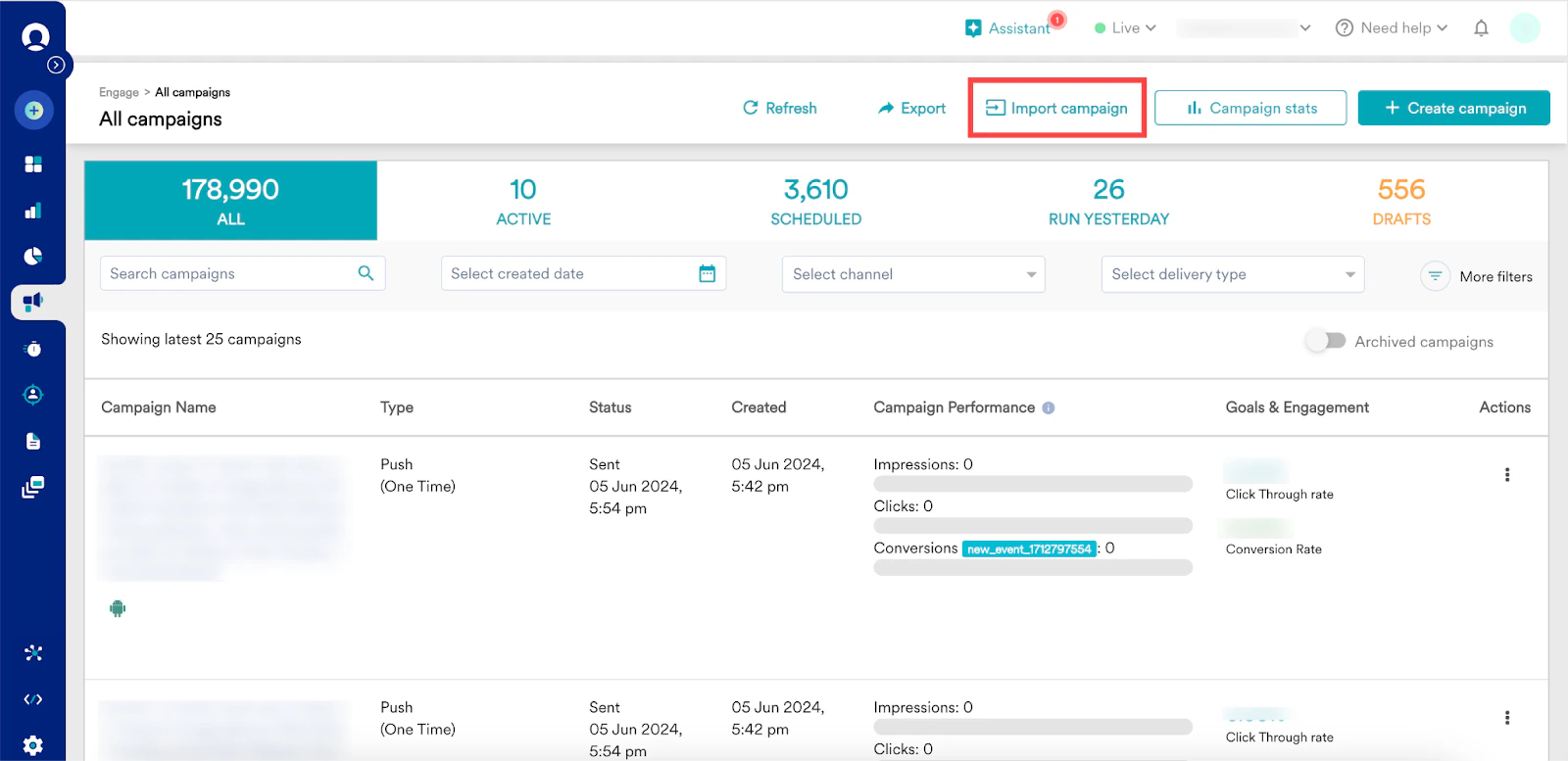Perform the following steps to migrate a campaign from one workspace to another:- Go to the All campaigns page in your MoEngage dashboard.