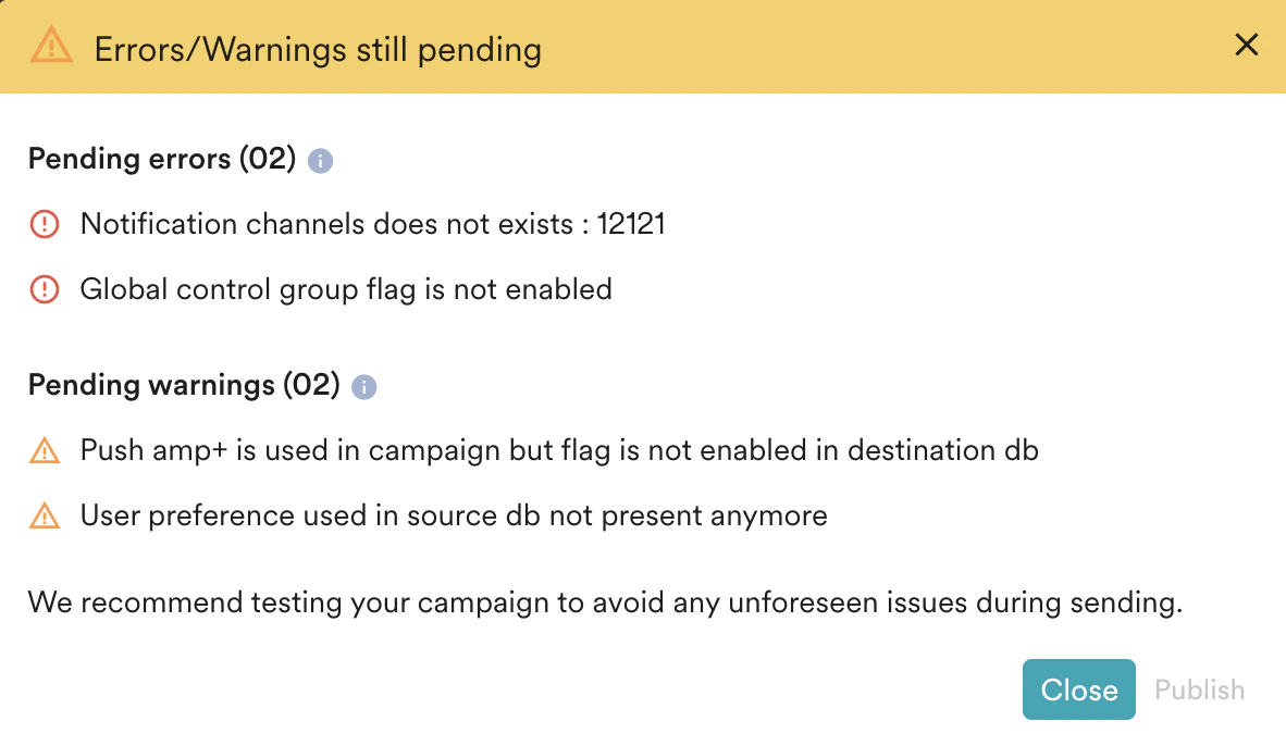 After you resolve the errors and warnings, click Publish to launch the campaign. If you attempt to publish the campaign without fixing all errors, the Errors/Warnings still pending dialog box appears. This dialog box lists all remaining errors and warnings. You must fix all errors to deliver your campaign successfully. You can publish campaigns with warnings, but not with errors.