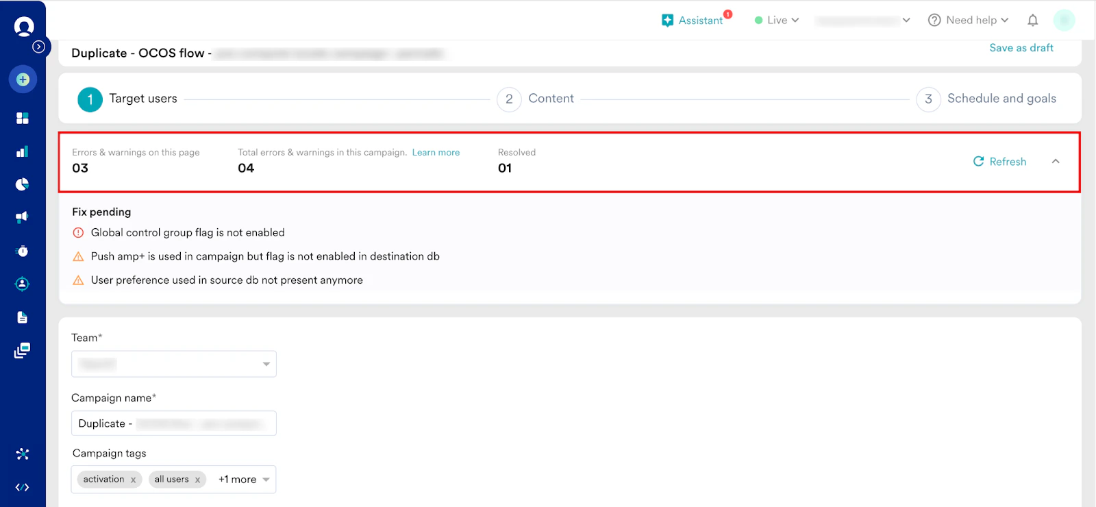 | Errors & warnings on this page | This shows the count of errors and warnings on the current campaign page or step. |