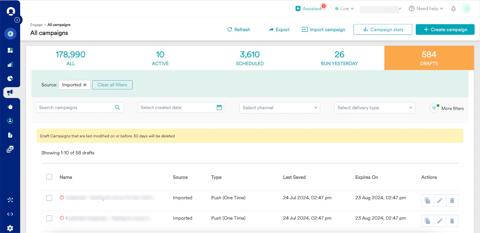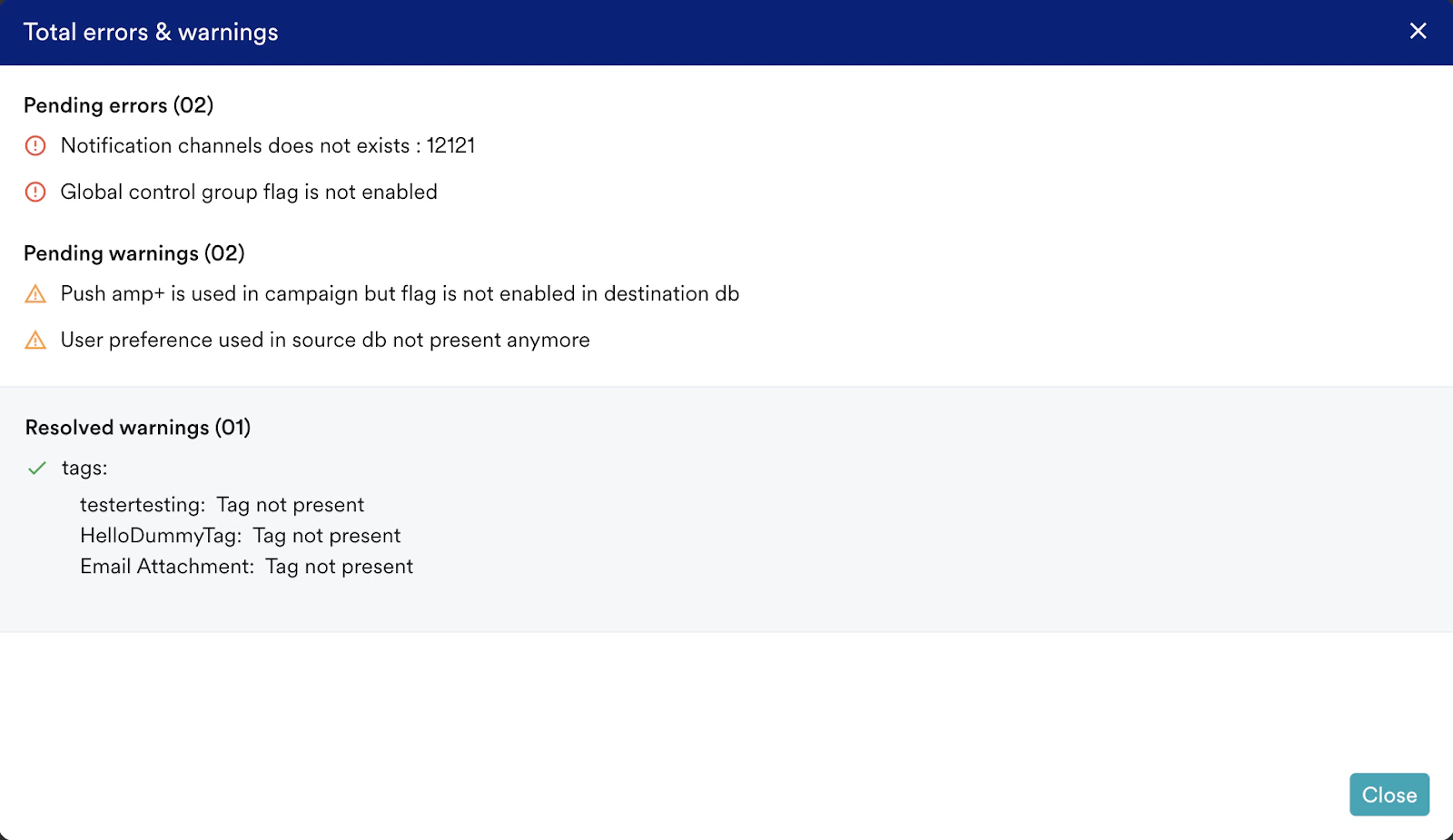 Status Definition Example Successful Indicates your campaign imported successfully. Imported with errors Indicates the imported campaign is missing a required field value. You must fix these errors before you can publish the campaign. For example, if a campaign in the source workspace uses a productpurchase event that is not available in the destination workspace, you will see the Imported with errors status. Imported with warnings Indicates the imported campaign has warnings. You can still publish the campaign with warnings, but fixing them is optional. For example, if a campaign in the source workspace uses a sales tag that is not available in the destination workspace, you will see the Imported with warnings status. Imported with errors & warnings Indicates the imported campaign has both missing required and optional field values. You must fix all errors before publishing the campaign. For example, if a campaign in the source workspace uses a Content API for personalization and also campaign tags, and these are not available in the destination workspace, you will see the Imported with errors & warnings status. Click the link provided to access the campaign in Draft mode and fix these issues. Failed Indicates the campaign failed to import because required conditions were not met. For example, if a WhatsApp campaign is created in the source workspace, but the WhatsApp channel is not enabled in the destination workspace, the WhatsApp campaign import will fail. To view the reason for failure, expand the arrow below the campaign name. You must correct the error and then publish the campaign in the destination workspace. - To view all imported campaigns, click View imported campaigns. This opens the Drafts tab on the All campaigns page. Here, campaigns imported display Imported as their source. Campaigns with errors or warnings have a warning or error symbol next to their name.