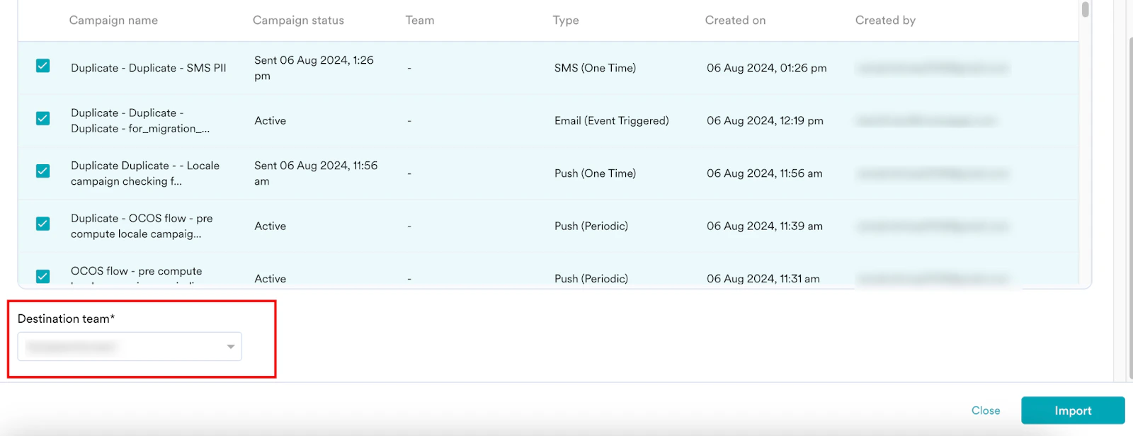 - If the Team feature is enabled for your workspace, select the Destination team to activate the Import option.