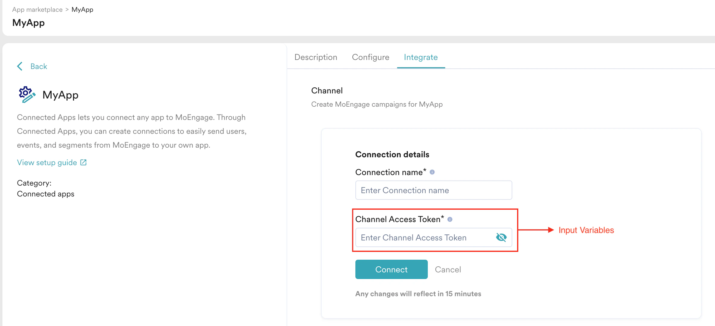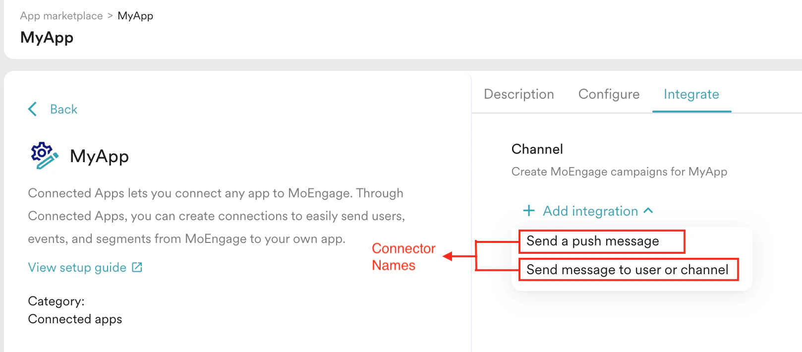 Connections to your Channel App are added from the App marketplace, as shown below: