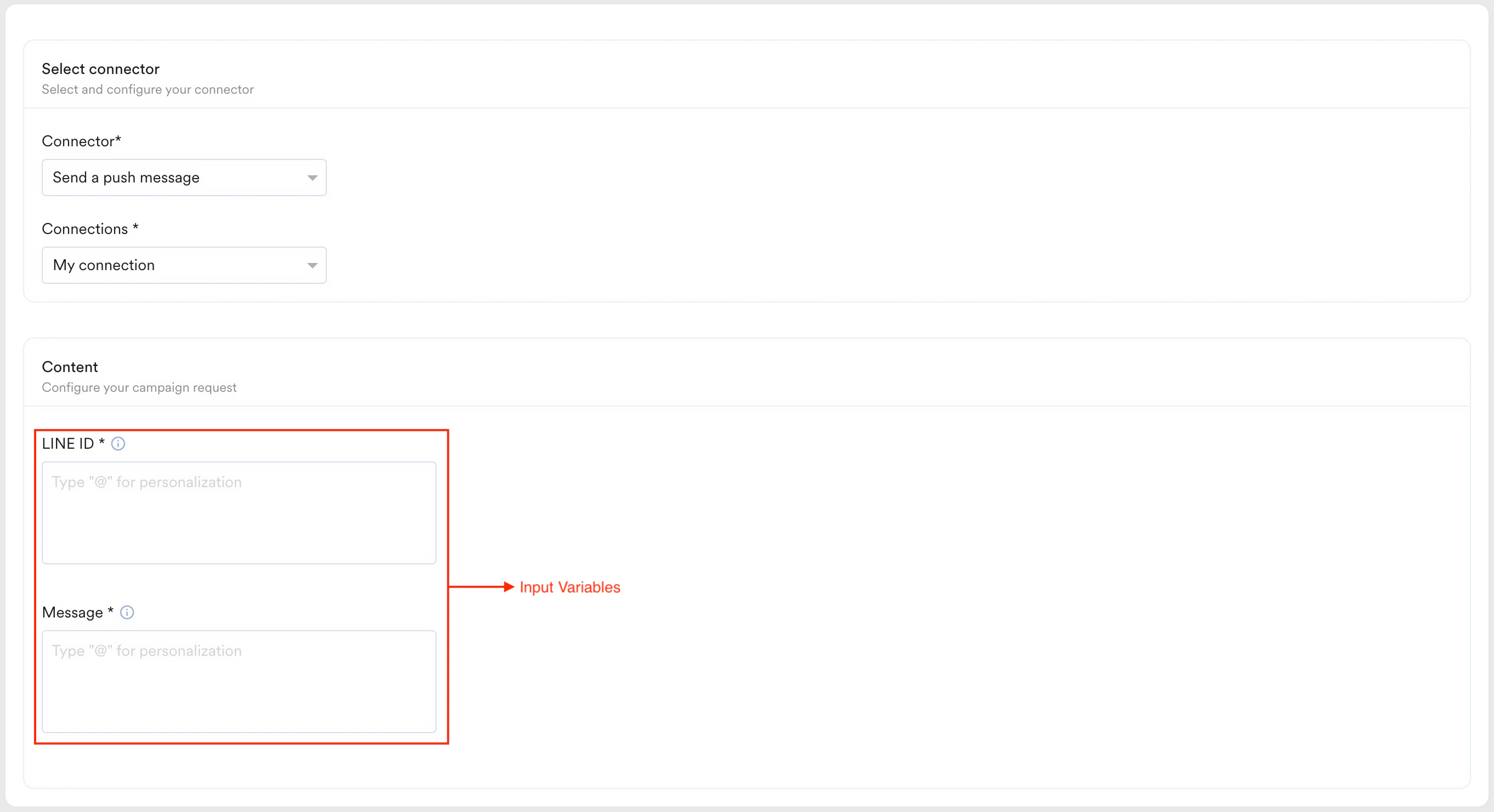 Connections to your Channel app are added from the campaign creation, as shown below: