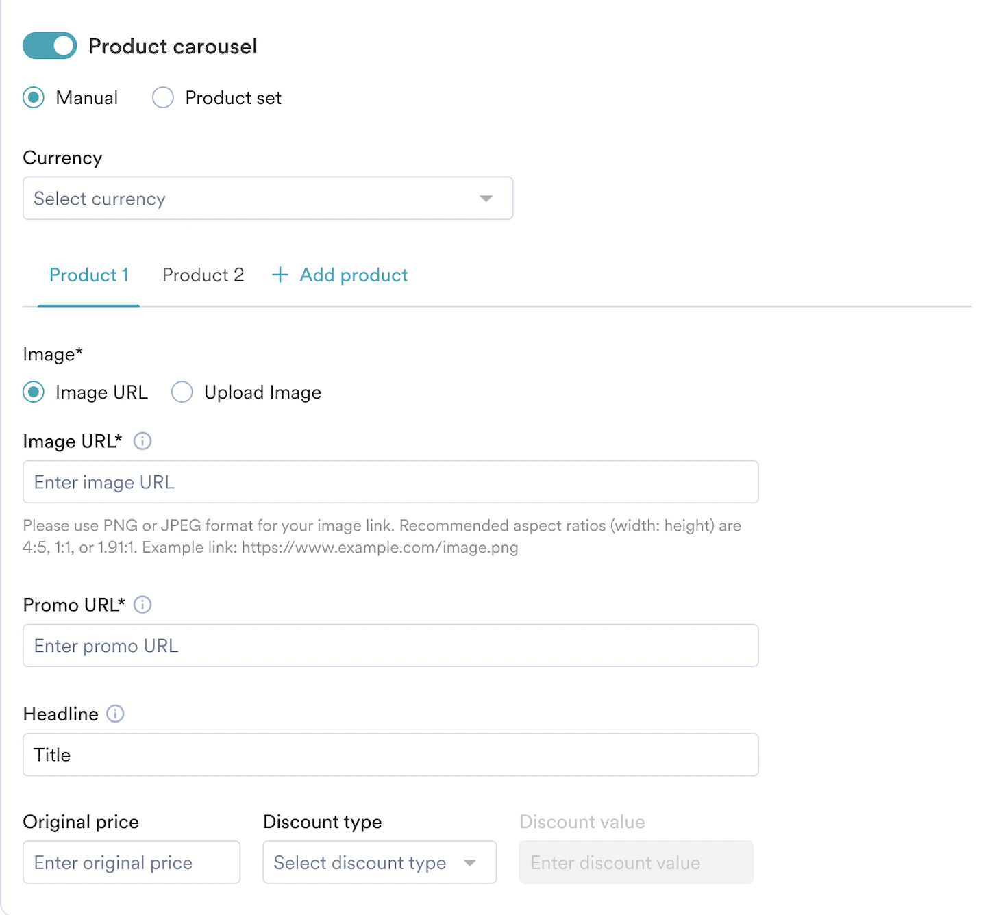 This option allows you to keep the list of products added to the carousel the same for all your targeted customers. This option is selected by default, and you must add at least two products to the carousel.Perform the following steps to create a product carousel using the manual option. You must provide the following details for each product you want to add to the carousel: Under the Product 1 tab, add the following details for Product 1; similarly, under the Product 2 tab, add the following details for Product 2. You can add a maximum of 10 products to the carousel by clicking + Add product.
