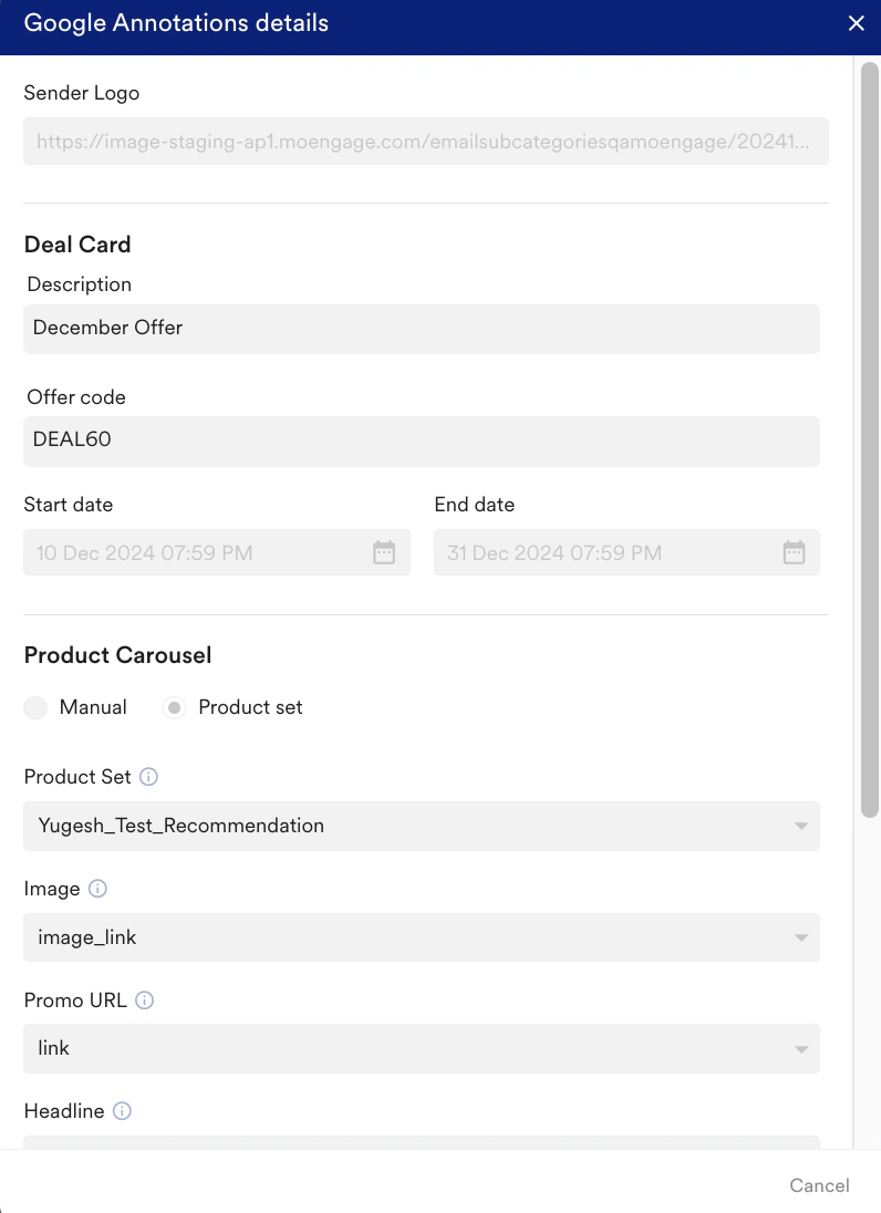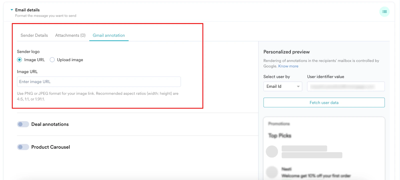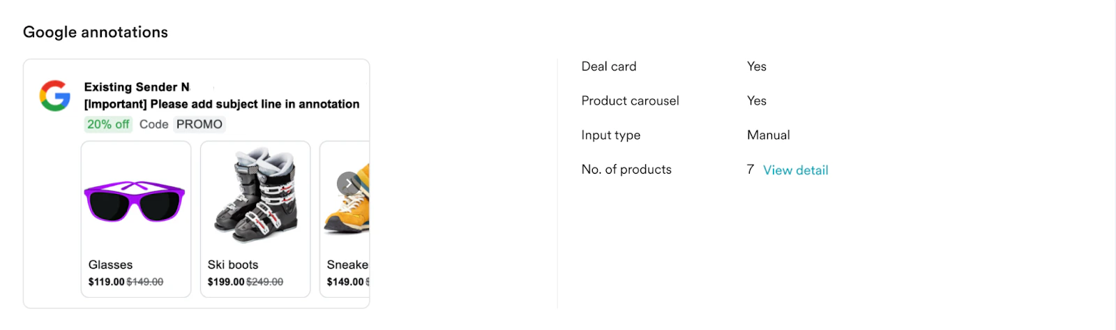 Gmail annotations help customers conveniently view and engage with your promotions from their inboxes. Annotating emails enhances the content of your emails within the Promotions folder by incorporating elements like images, deals, and expiration dates from which customers can directly access the information without opening the emails. You can annotate emails to display the following features in the Promotions tab of Gmail:- This feature applies to recipients who use Gmail as their mailbox provider.