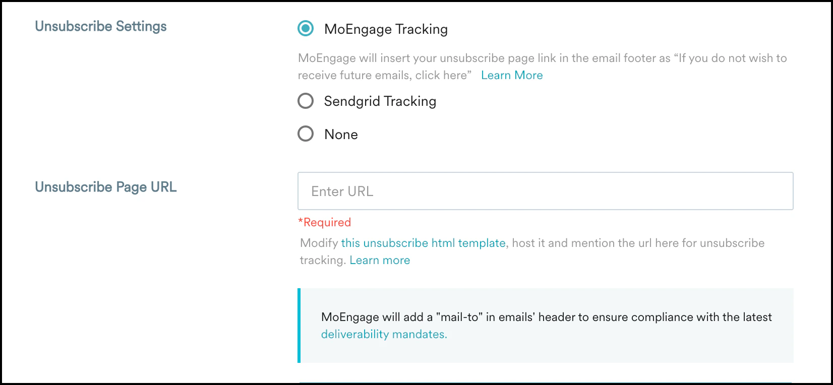 If you choose Mandrill tracking for unsubscribe management on the MoEngage dashboard, then ensure that you make the corresponding change in the subscription tracking section of Mandrill.