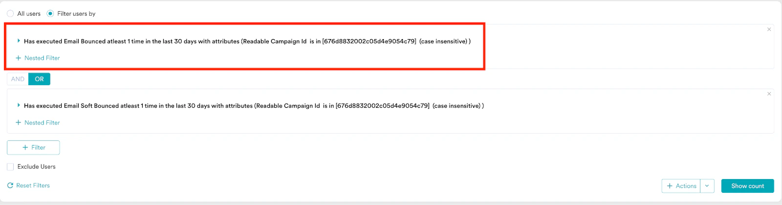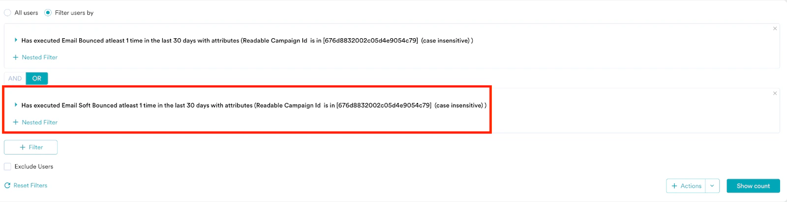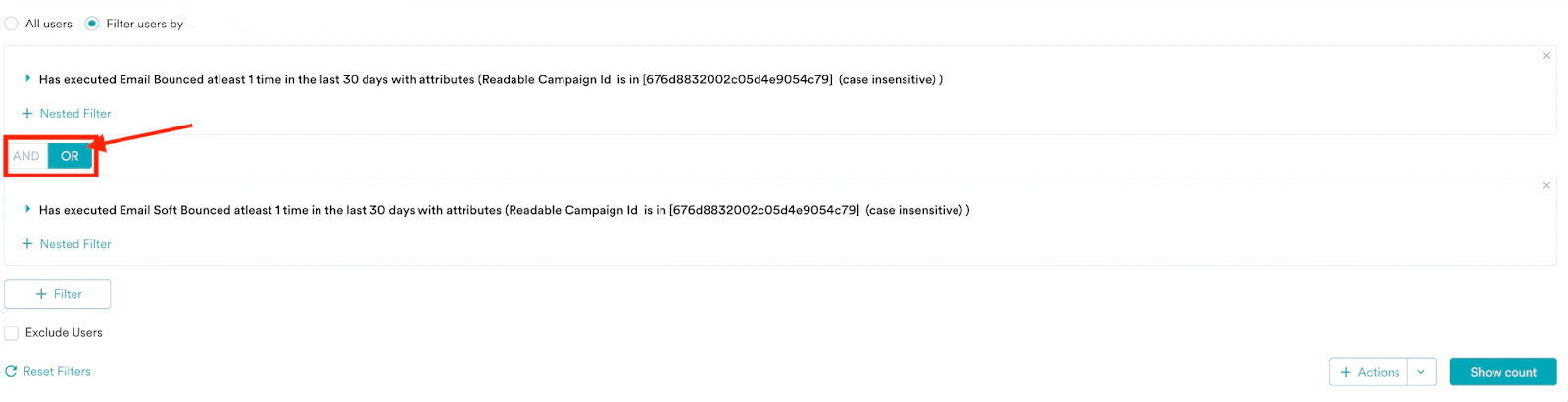 - While creating the segment, use the OR condition instead of the AND condition between the Email Bounced and Email Soft Bounced events in the nested filters.