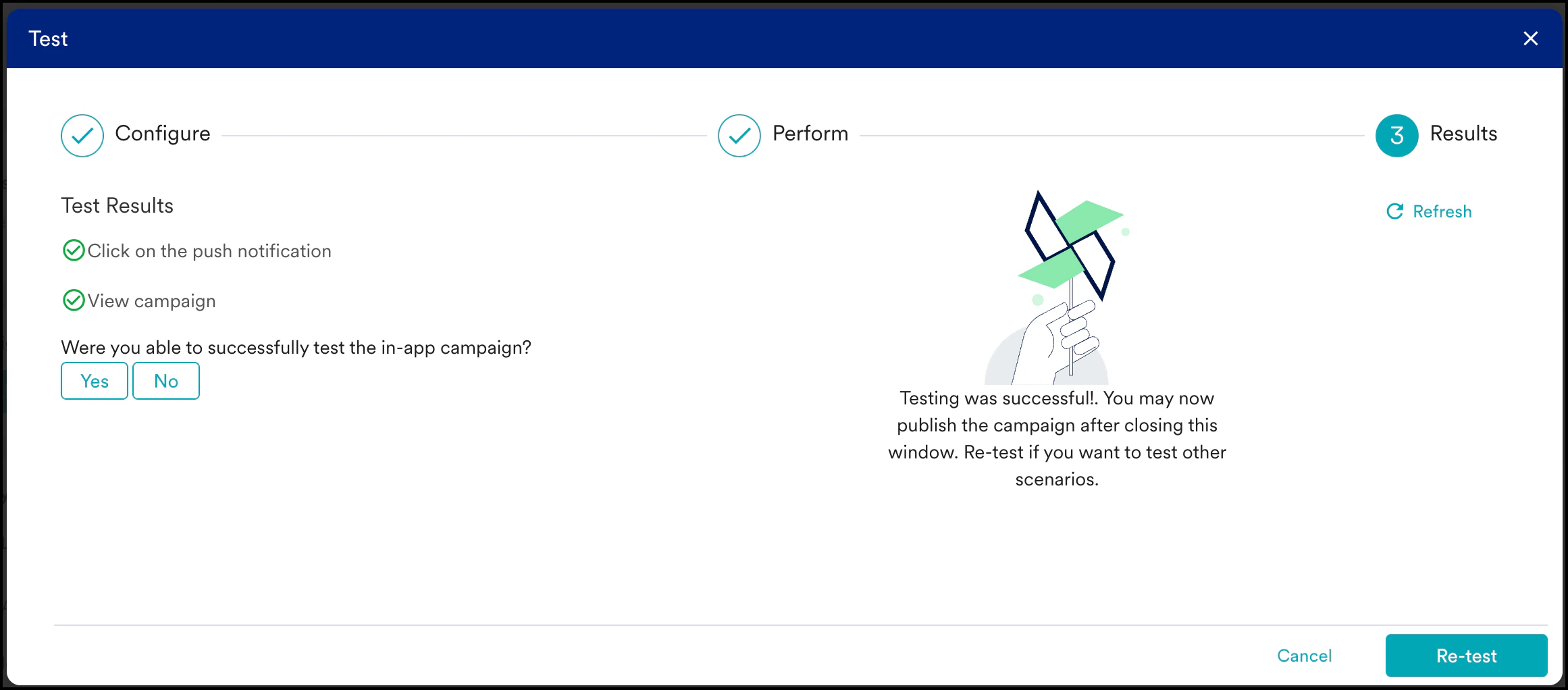 - Click the Re-test button in the bottom-right corner of the pop-up to re-test your In-App campaign.