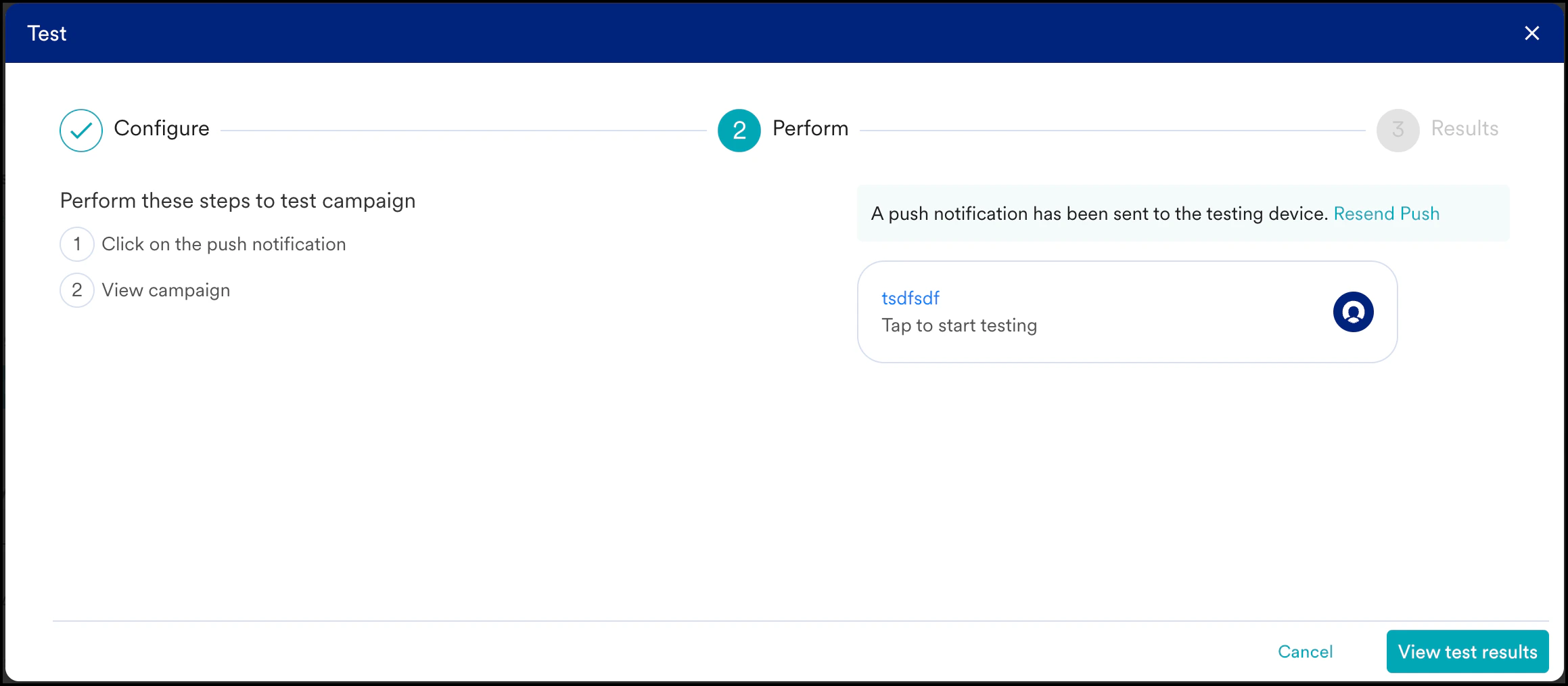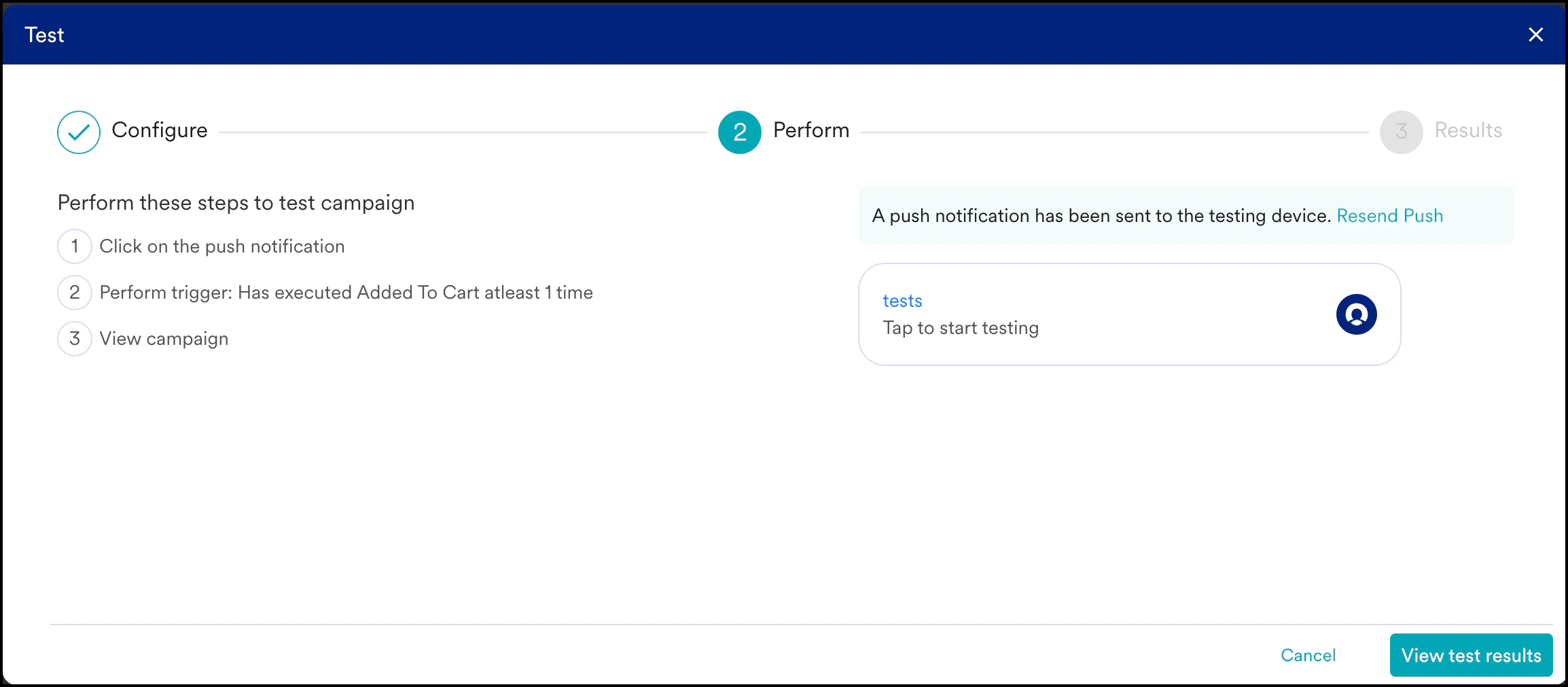 When testing an in-app campaign with a custom trigger event, a step appears: Perform trigger: The trigger you selected To complete this test, perform the custom event you selected in your app. For example, if your campaign is triggered by an “Add to Cart” event, click the Add to Cart button in your app. After you complete the steps, click View Test Results.