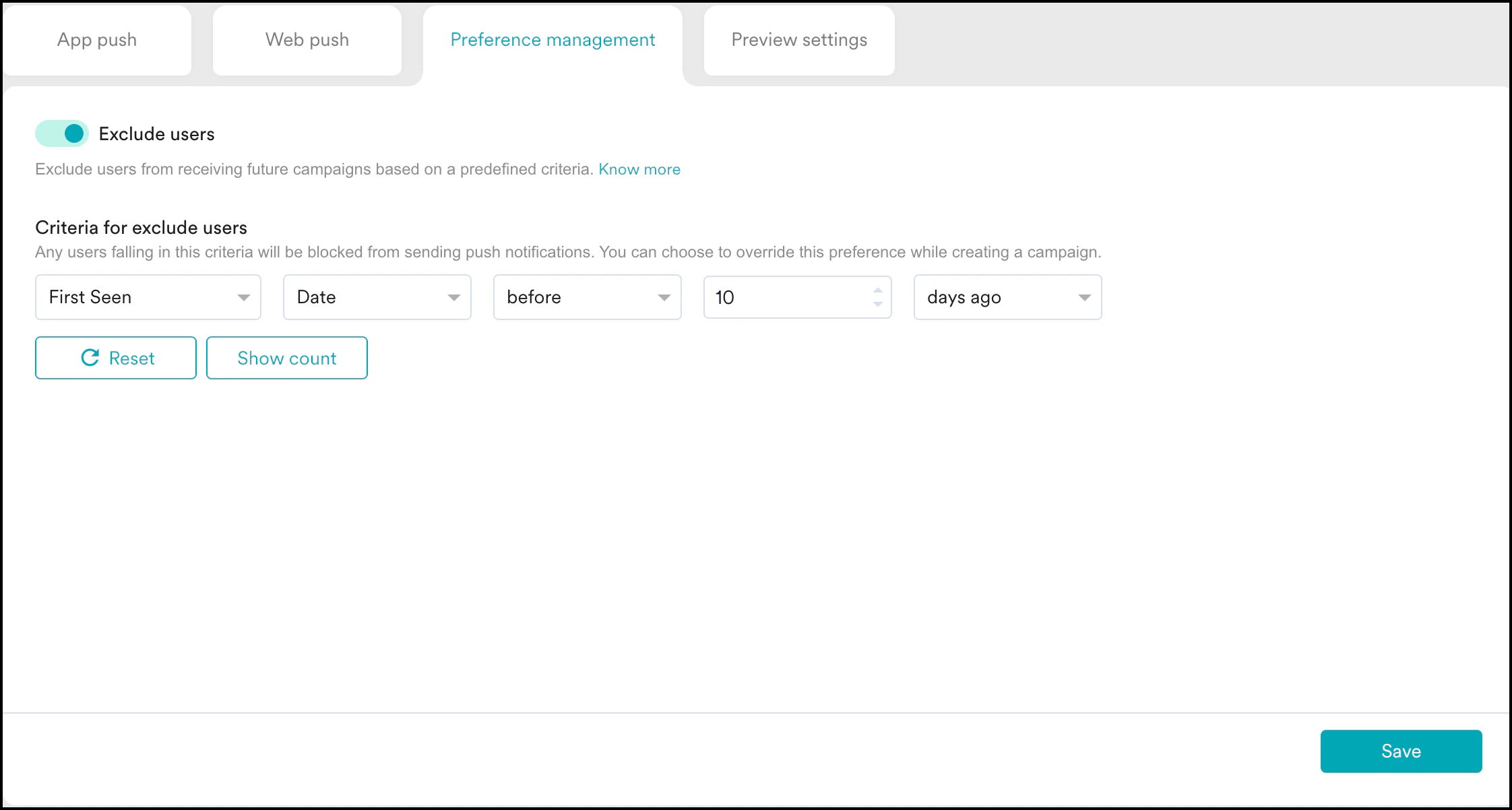 - Add a filter for the users you want to exclude in the Criteria for excluded users section. You can see the count of these users by clicking on Show Count.