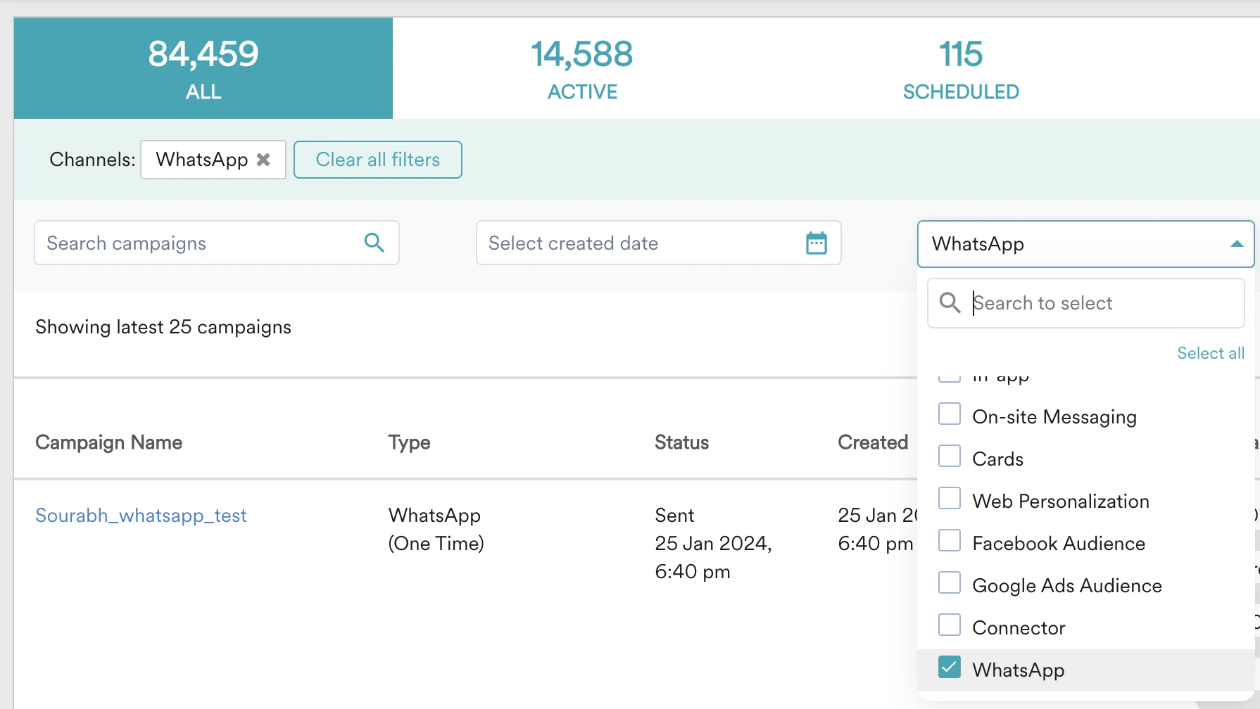- On the All Campaigns page, use the filters to find the campaigns you want. You can also use the channel filter to see only WhatsApp campaigns.