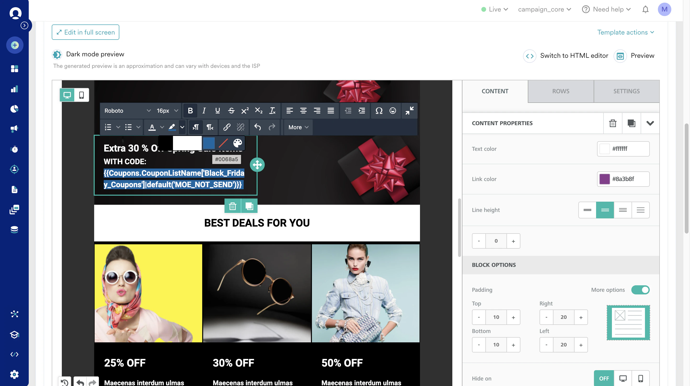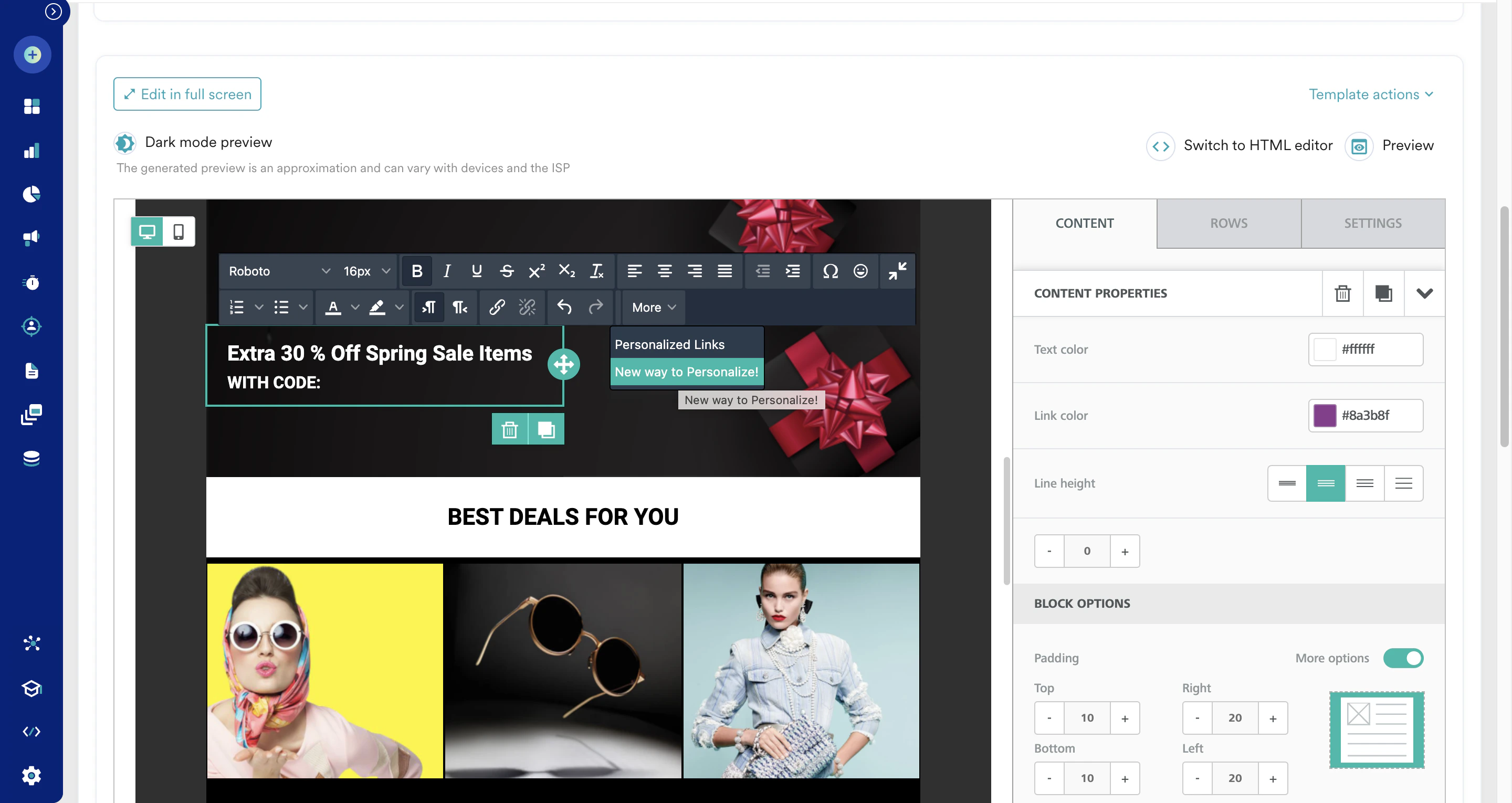 - Select the text section where you want to place the coupon code reference in the email body and click New way to Personalize.