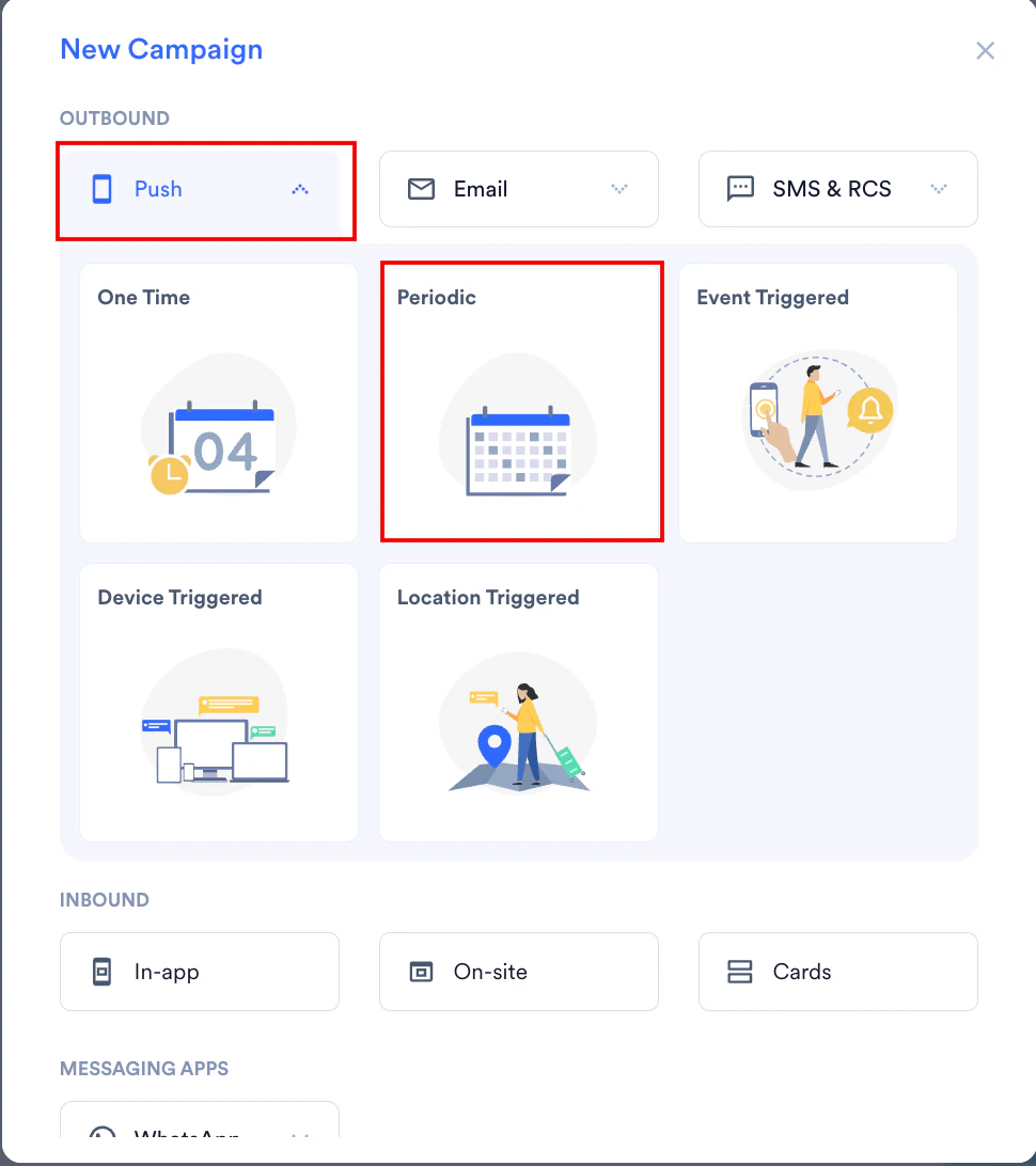 - Click **Periodic **campaign, and you can follow the same steps for any other email campaign type. For more information about delivery types, refer to Delivery Types.