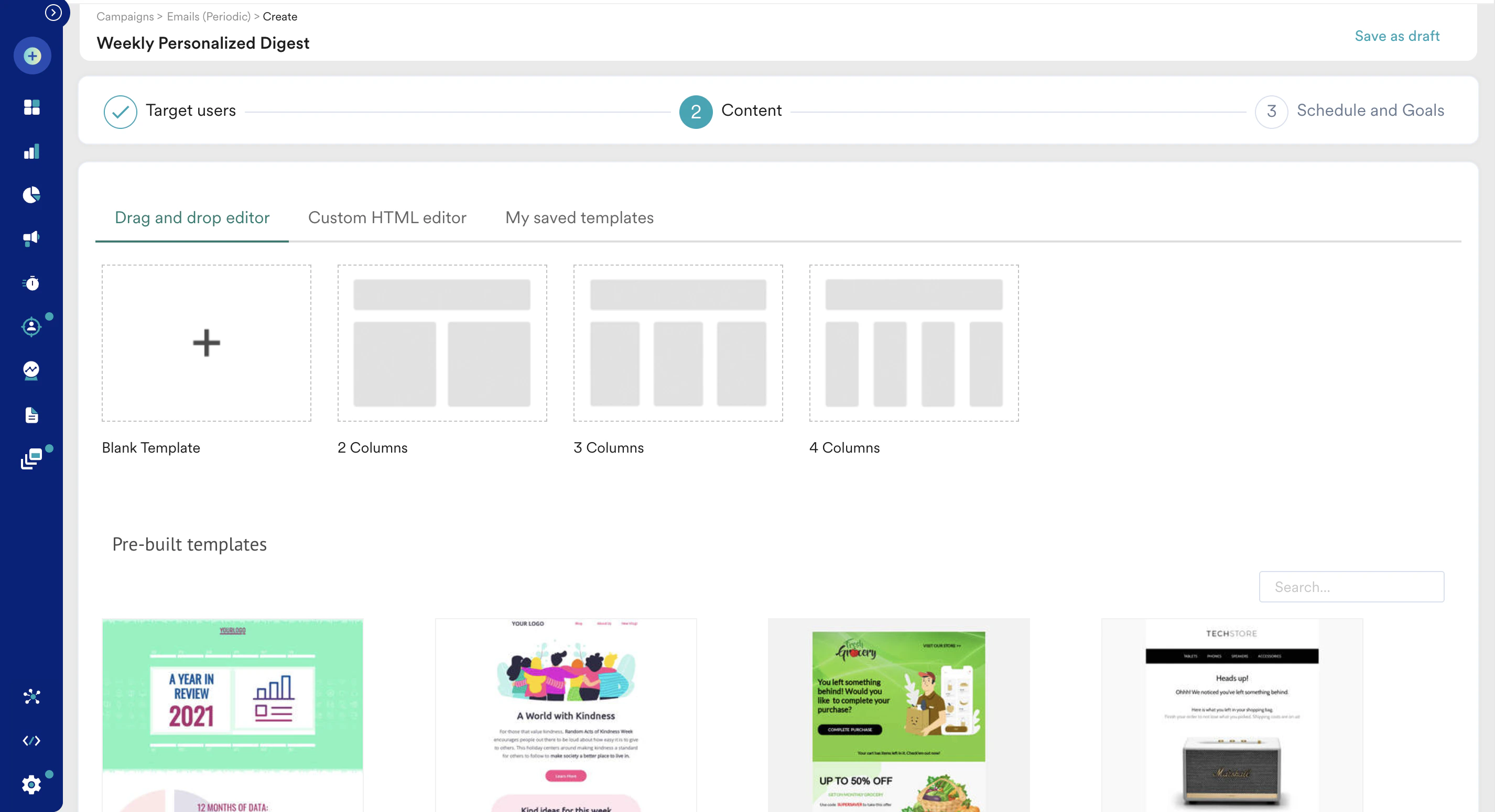 6. In step 2, on the Content tab, click the Drag and drop editor tab and select a template from the available options. You can also select a template from Pre-built templates and customize it for your use case.