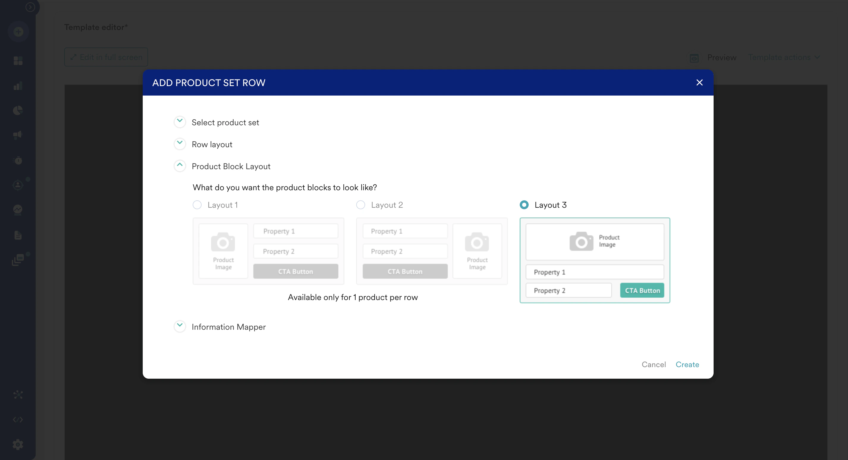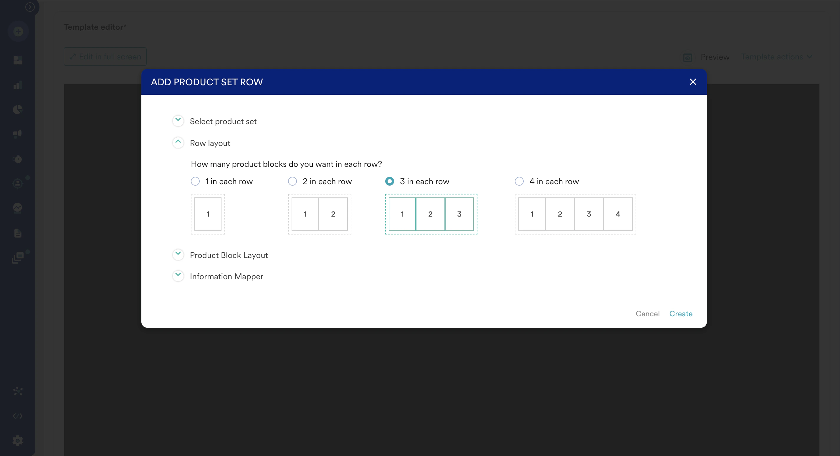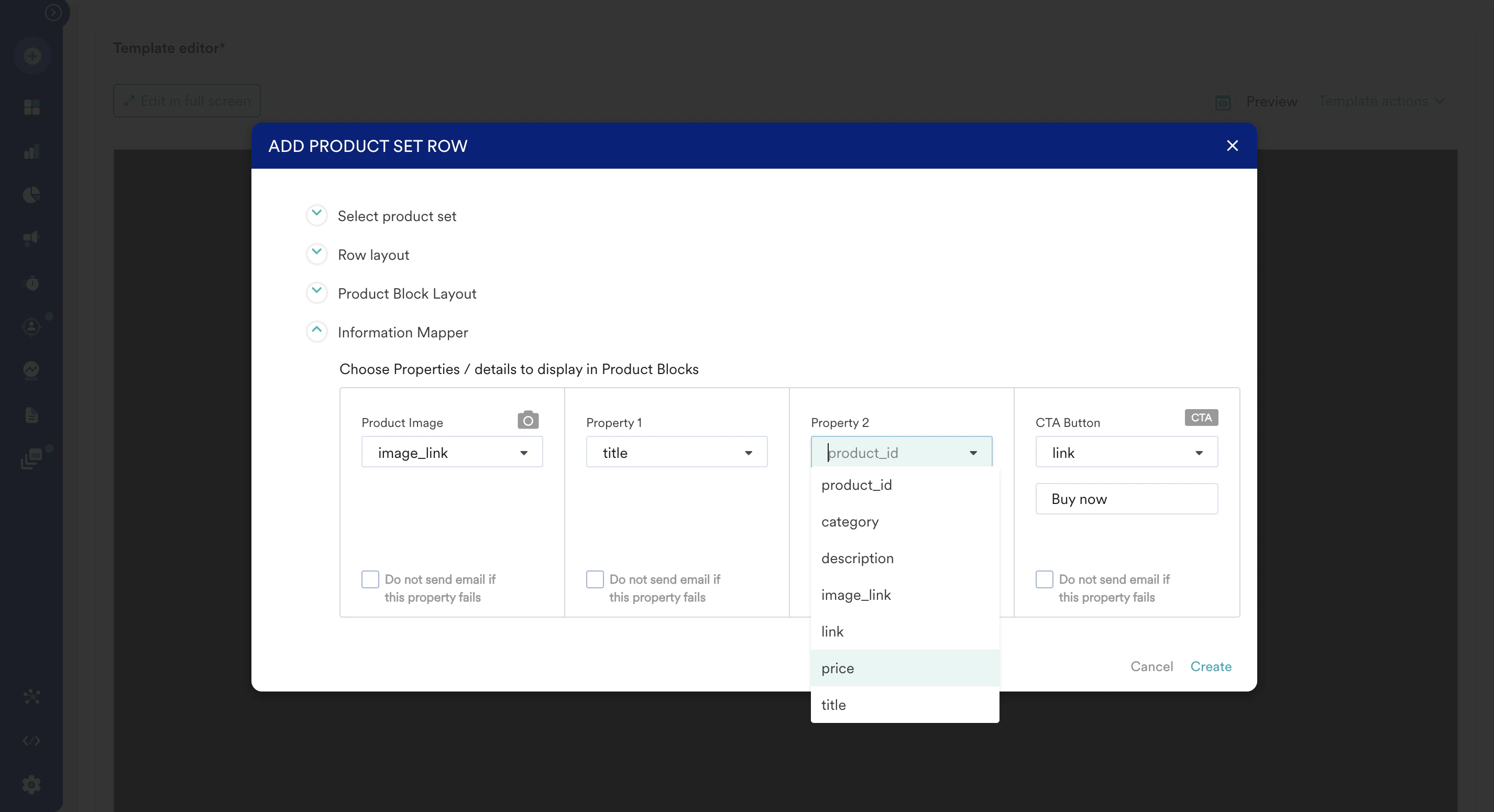 15. After the configuration is complete, click Create. This creates rows with dynamic placeholders of items that you can drag and drop to the left side of the email content body.