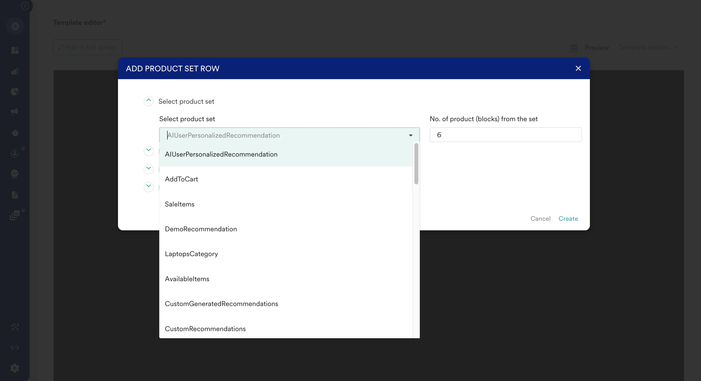 9. Click the ROWS tab on the right side of the editor and choose Product Sets from the drop-down list. The ADD PRODUCT SET ROW popup with a list of active recommendations is displayed.