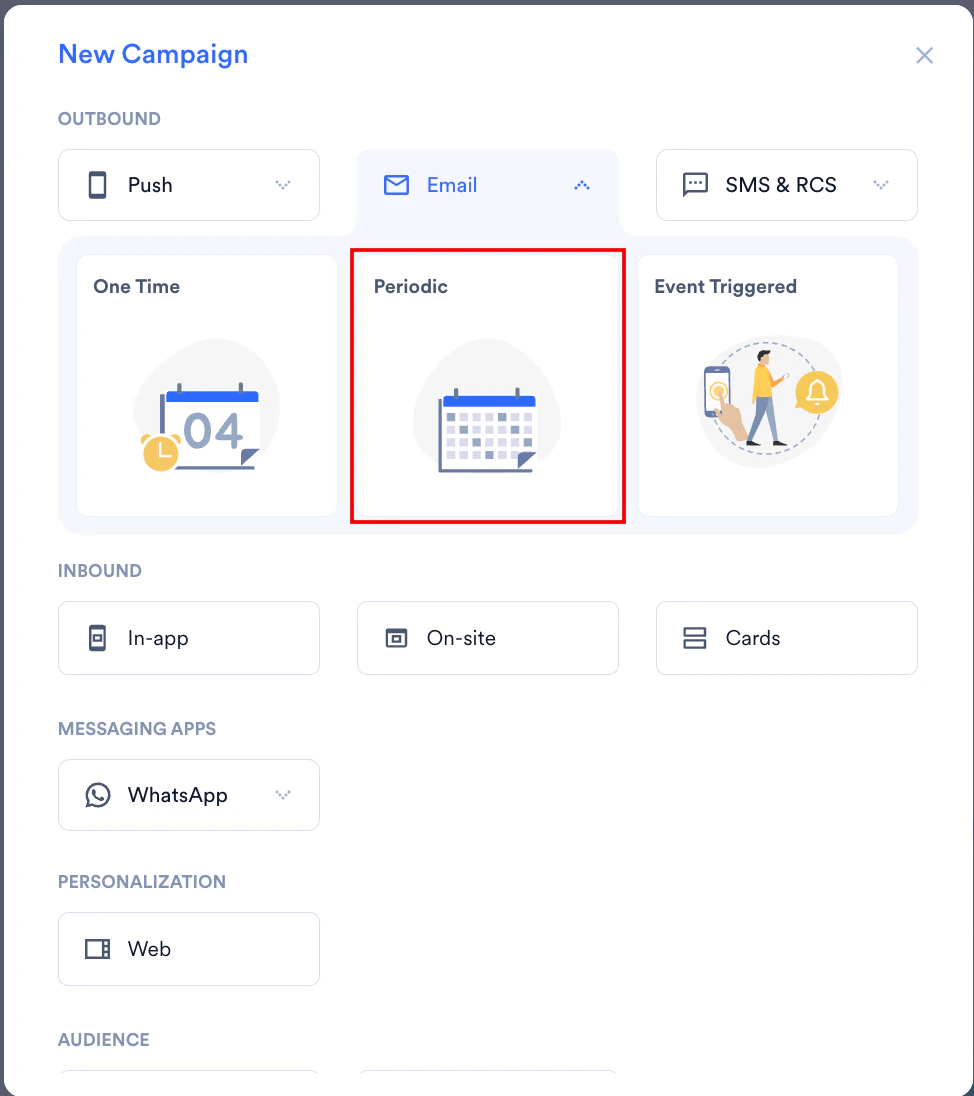4. Click Periodiccampaign, and you can follow the same steps for any other email campaign type. For more information about delivery types, refer to Delivery Types.