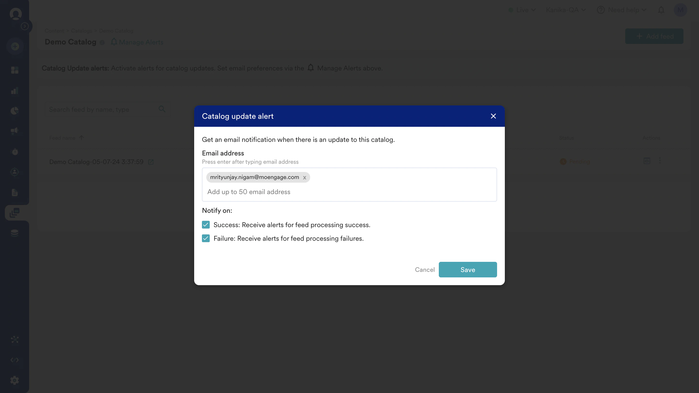 Feeds act as the data source for item information in the catalog. Feeds allow you to upload, update, or sync item information. They contain a set of items fetched or uploaded from a source.Whether you have a single feed for all items or multiple feeds for different purposes, MoEngage offers the flexibility to fulfill your specific requirements.