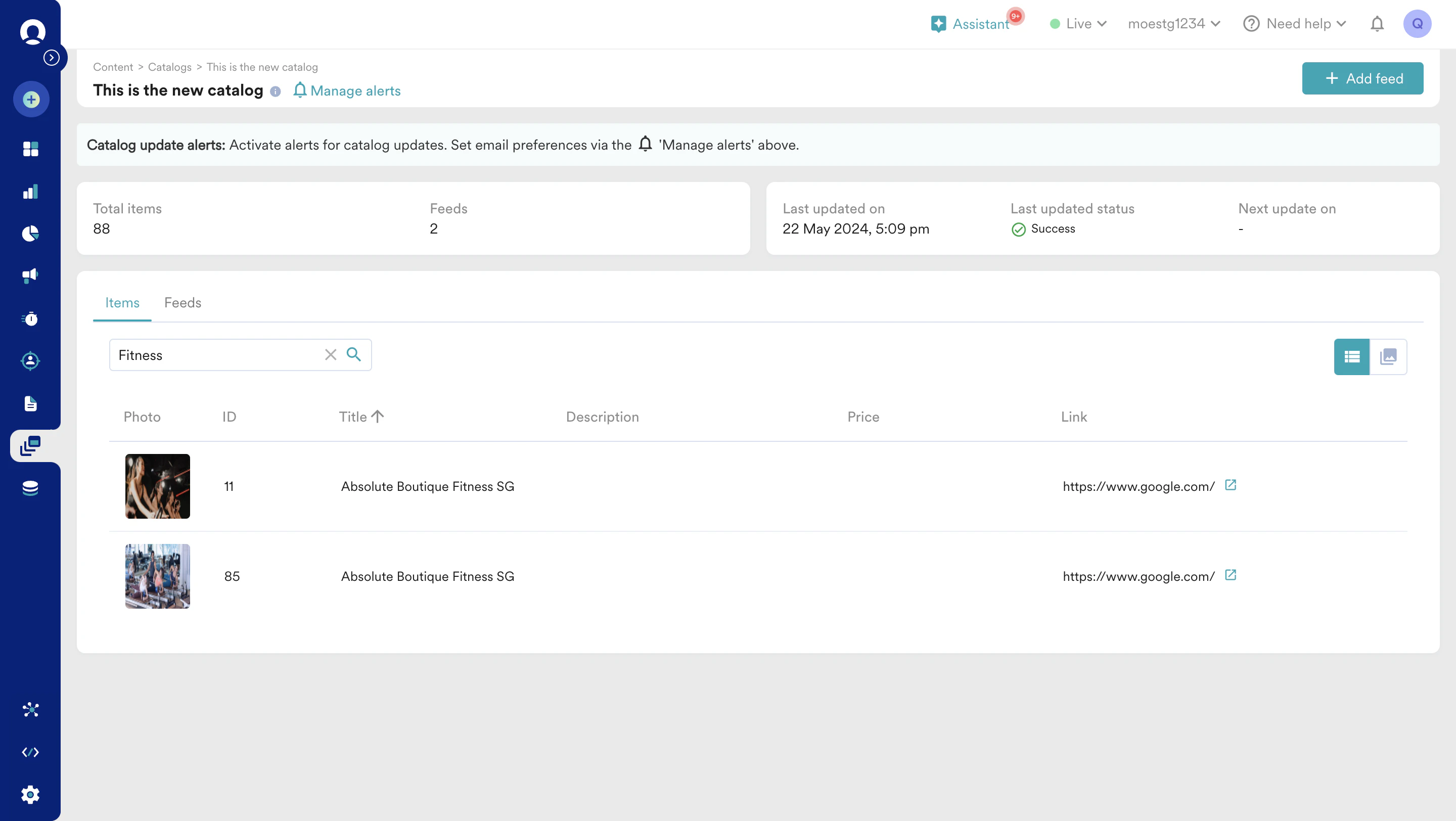- Total items: The count of data source(s) feeds configured to populate and update the catalog.