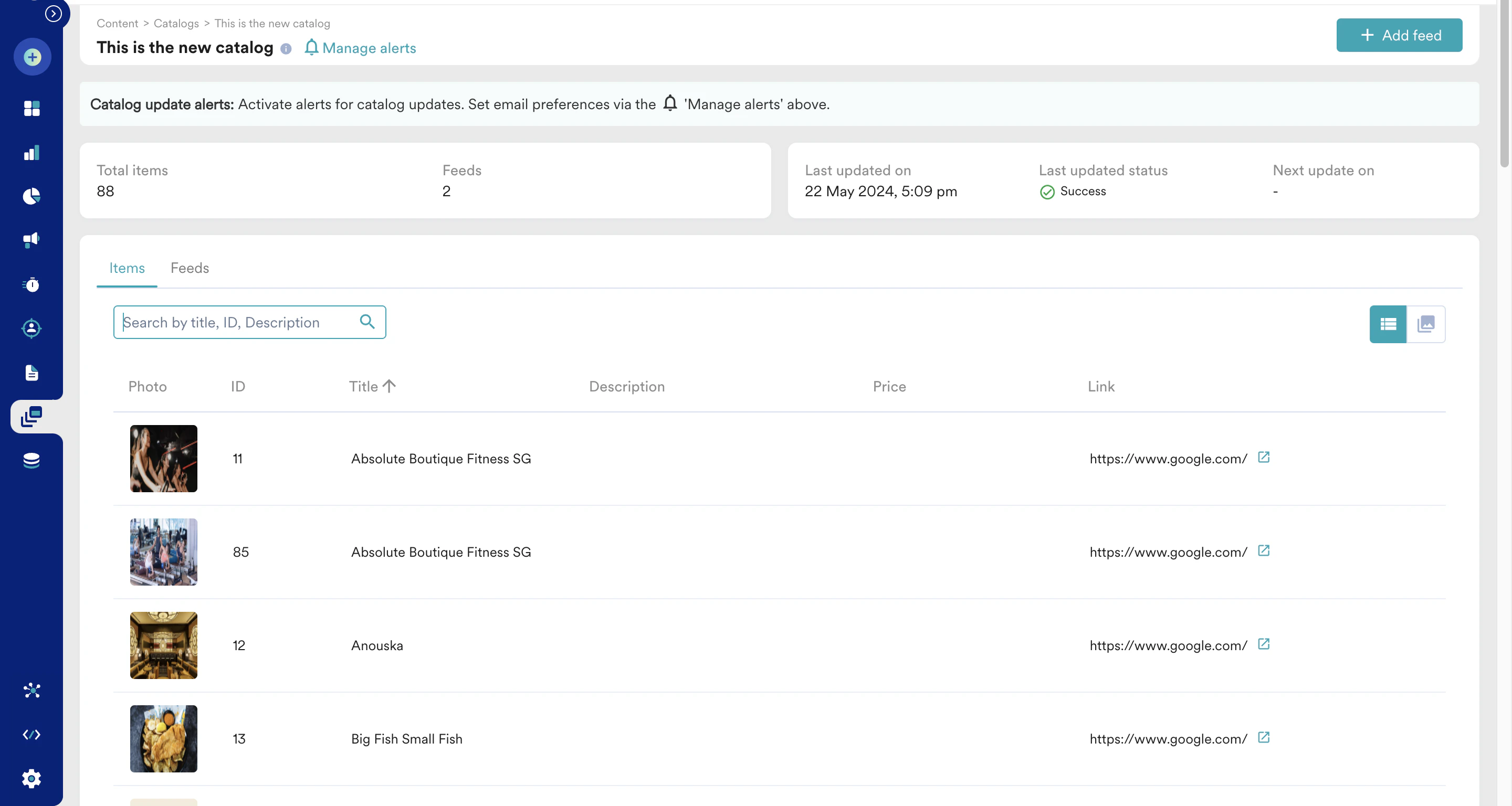 - Last updated on: This information tells you when the catalog was last updated. In cases with multiple feeds, this will reflect the most recent feed update time.