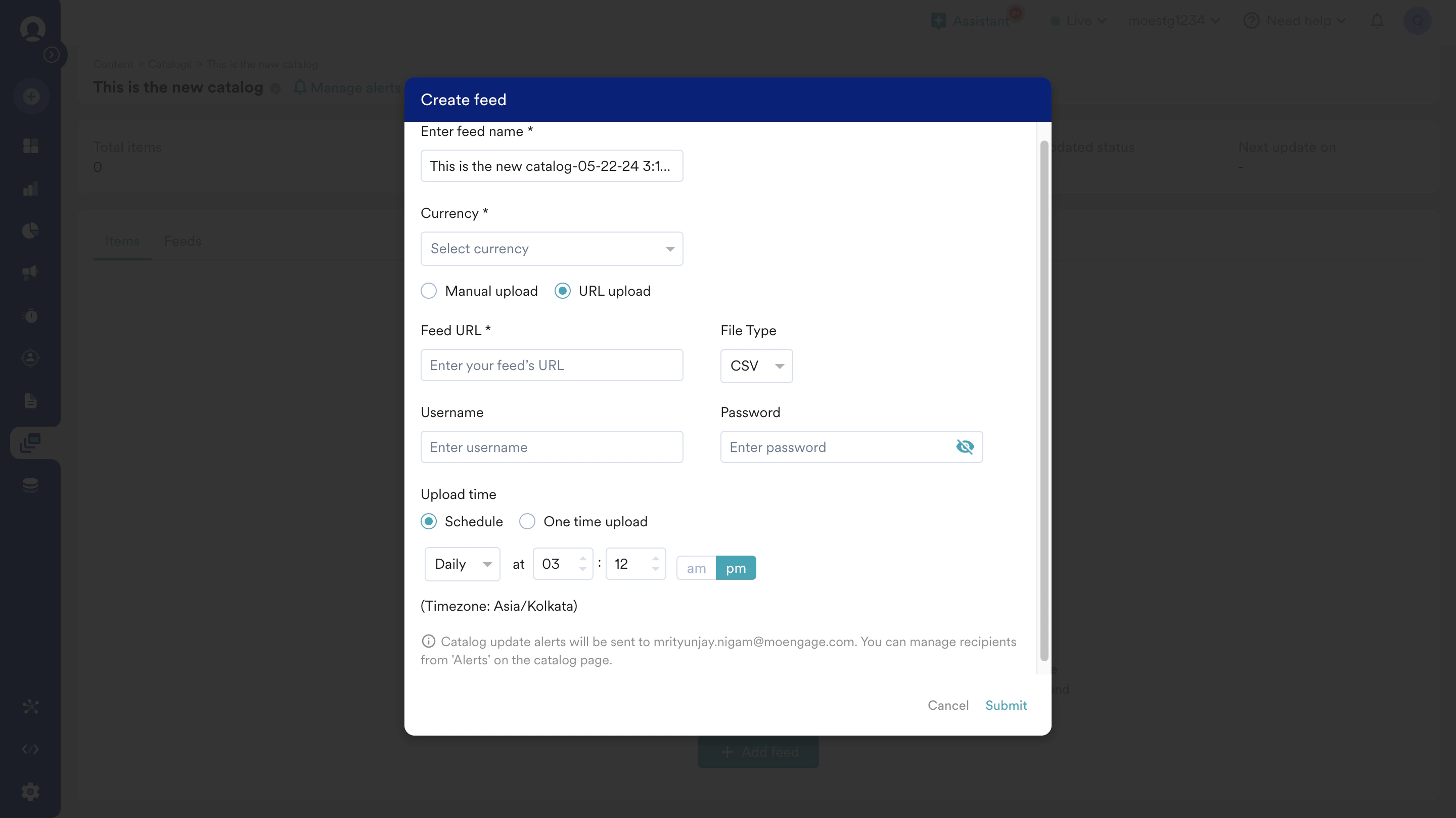 URL Upload: Marketers can establish a connection with their external catalog and sync it with MoEngage by defining the catalog source URL. This enables timely synchronization and updates of relevant item attribute information. With options such as daily, weekly, or hourly intervals, marketers can ensure their item information remains up-to-date in MoEngage, making it ideal for almost real-time or frequent updates to the item catalog.