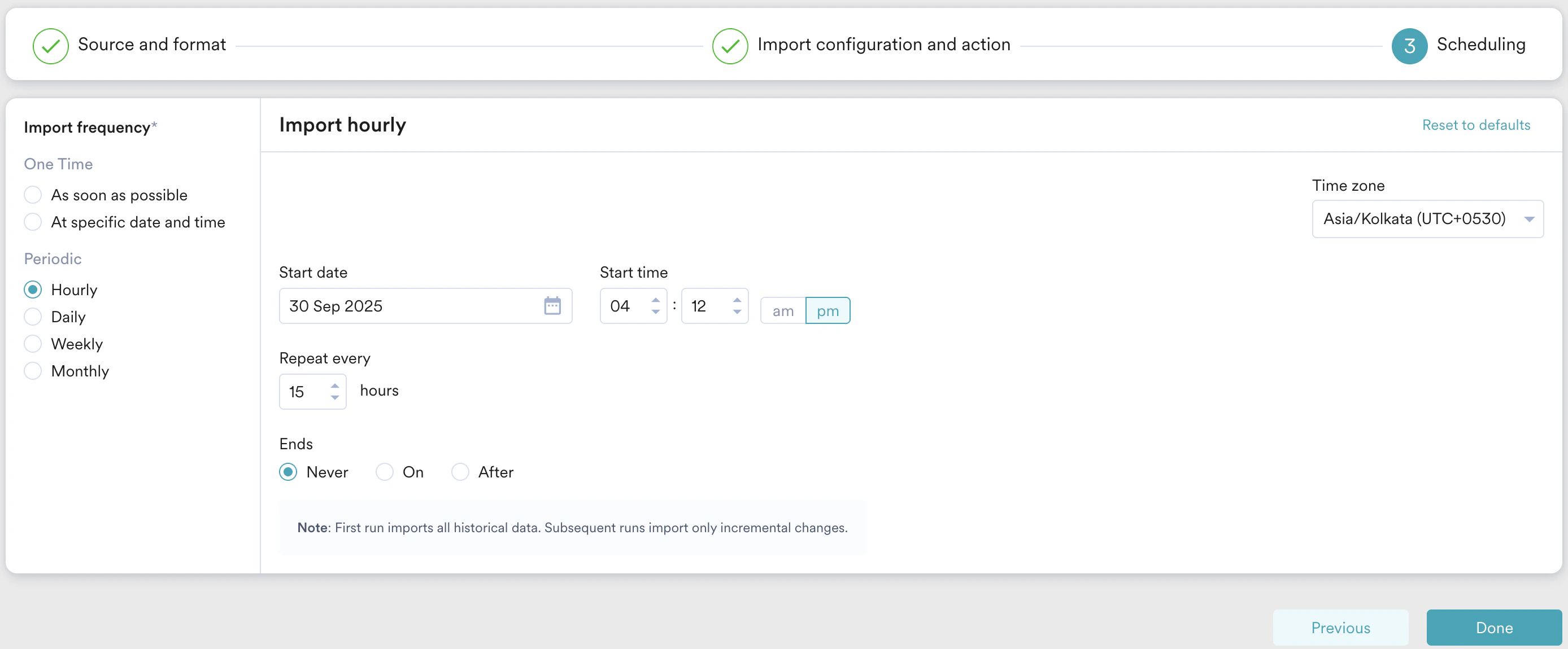 - Periodic: You can choose to run your imports every hourly, daily, weekly, or monthly, or with intervals and advanced configurations.