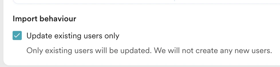 In the case of User Imports, you can also choose to update existing users only. This is helpful when you want to bulk update users’ attributes in MoEngage without creating any new users. To enable this, check the “Update existing users only” option under Import Behaviour: