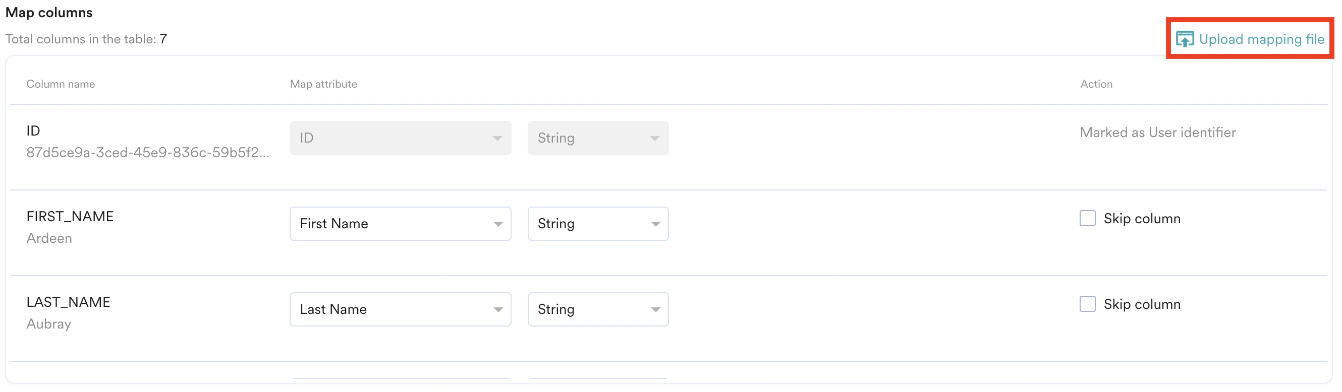 Optionally, you can choose to auto-map these columns by uploading a manifest file. To upload a manifest file, click the “Upload mapping file” option on the top-right of the mapping table:![]() | ![]() |