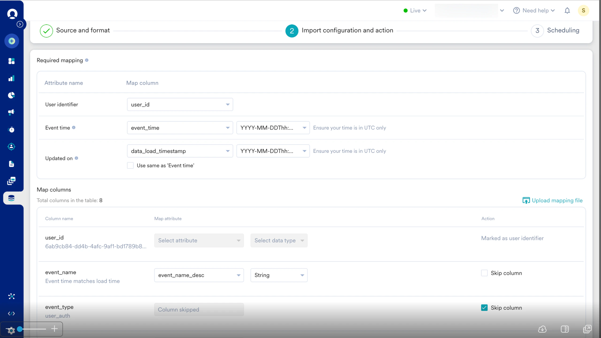 - Any columns mapped to a non-existent MoEngage attribute (which you choose not to create via the modal) will be left blank for manual mapping.