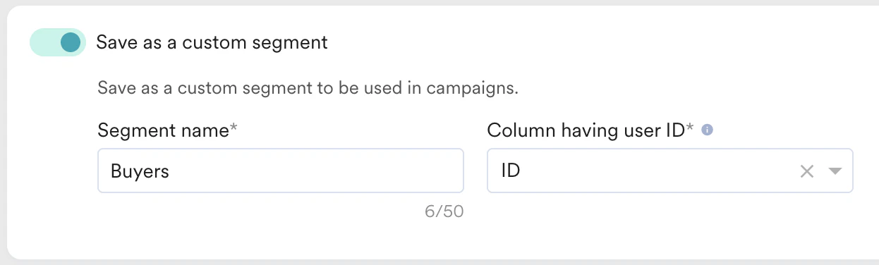 If you’re importing users, you can also add them to a custom segment inside MoEngage. Each time the sync is run, the imported users will continue to be added to this custom segment. We will not delete any users from this segment. You can then send targeted campaigns to this segment. To save your imported users in a custom segment, enable the “Save as a custom segment” option:
