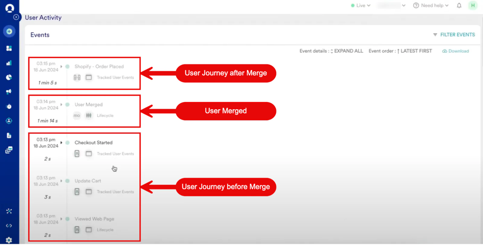 - Events info: All events of the merged user are transferred to the retained user, hence no events are lost during a user-merge. The resolved user will have events of all the merged users.