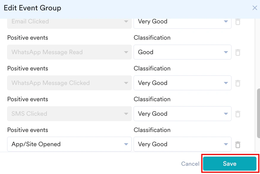 - Remove events: Click the Trash icon next to any event row to delete it from the classification logic.