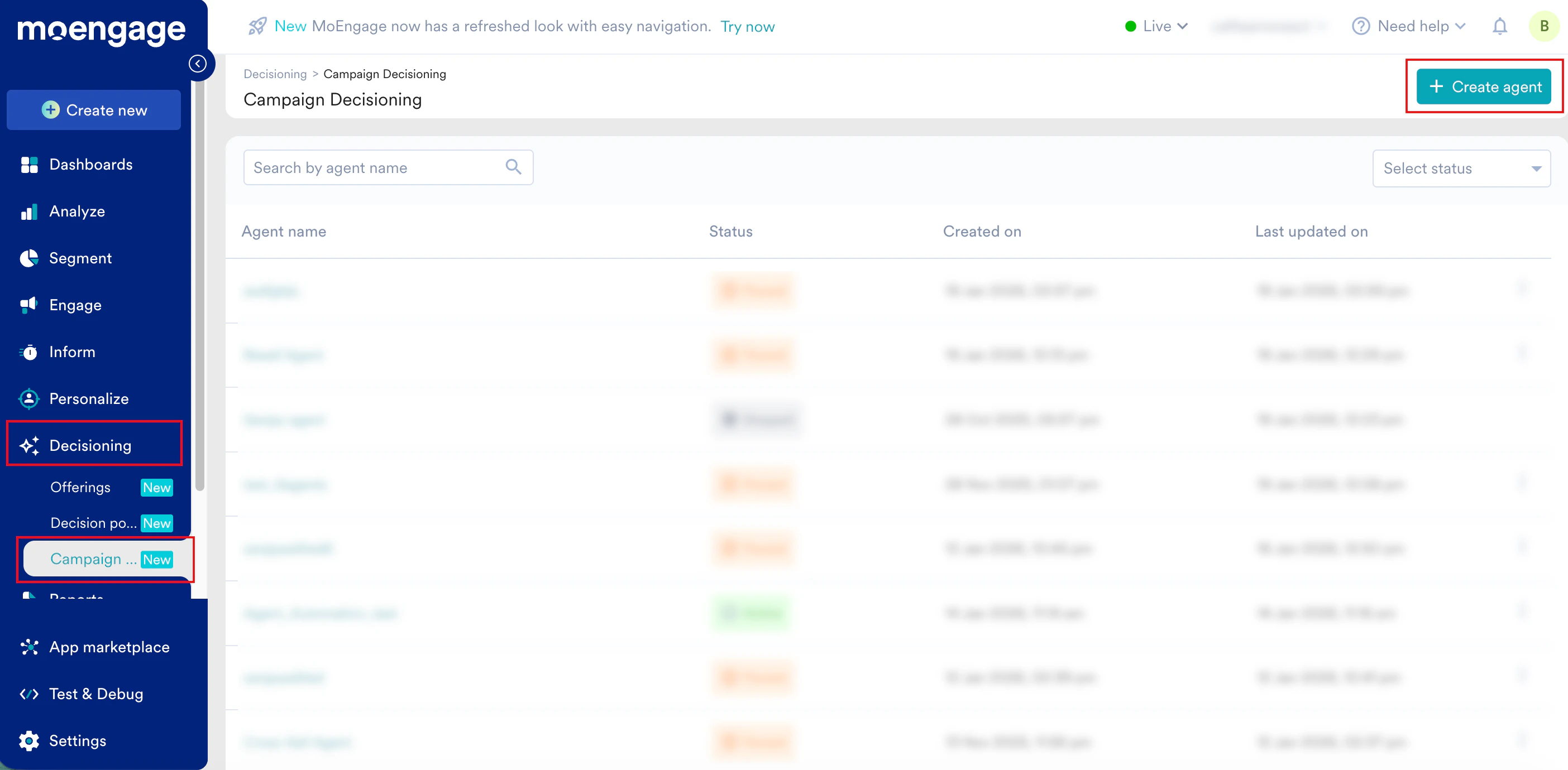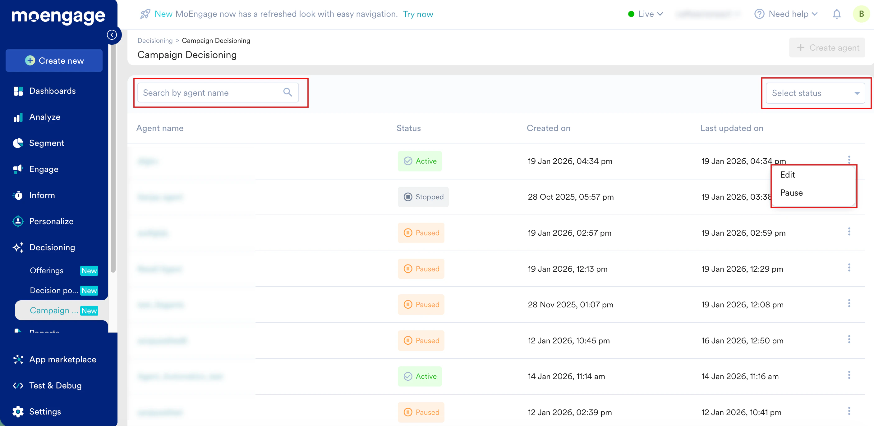 The Campaign Decisioning page lists all agents you have created. After creating the agent, navigate to Decisioning > Campaign Decisioning. On this page, you can:- Search and filter: Use the search by agent name box to find an agent by name or use the Select Status list to filter by Active, Paused, or Stopped.