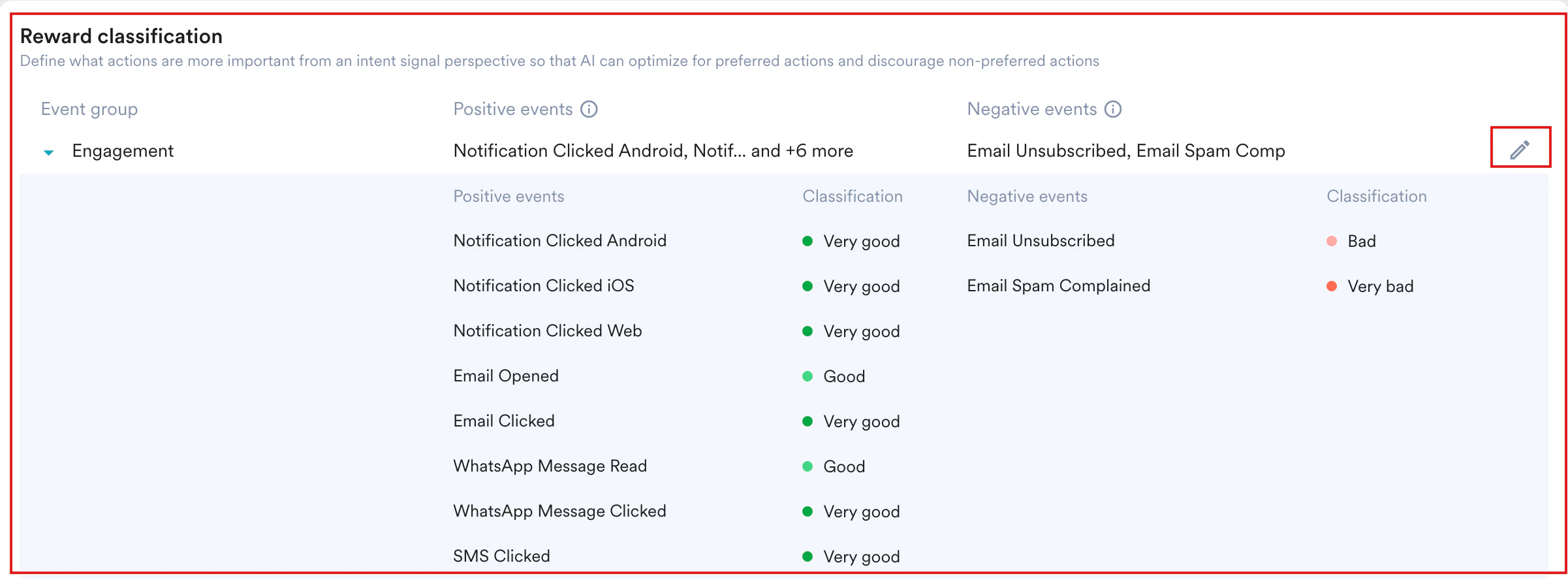 - In the Reward classification section, define the Intent Signals the AI uses to optimize its decisions.