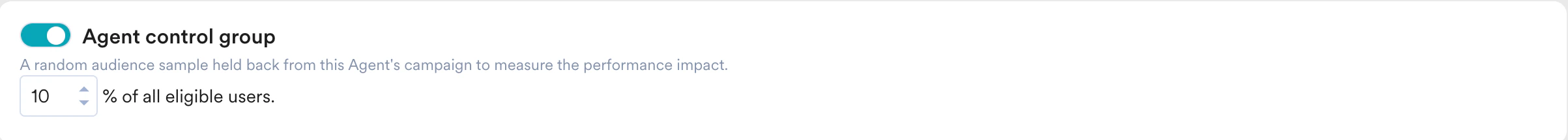 - Agent Control Group: Turn this toggle on to set aside a random sample of users (for example, 10%) who will not receive communications. This serves as a baseline to measure the AI’s actual impact.