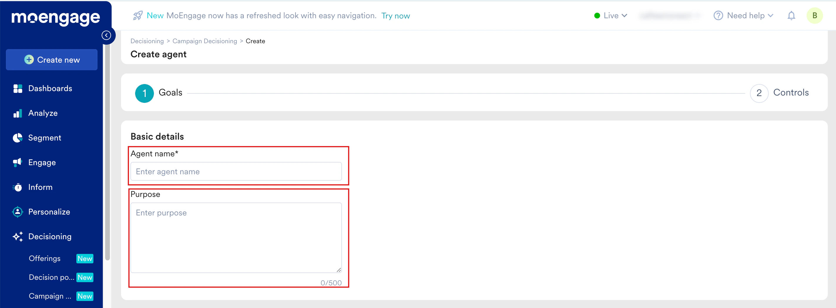 - On the Campaign Decisioning page, click + Create agent.
