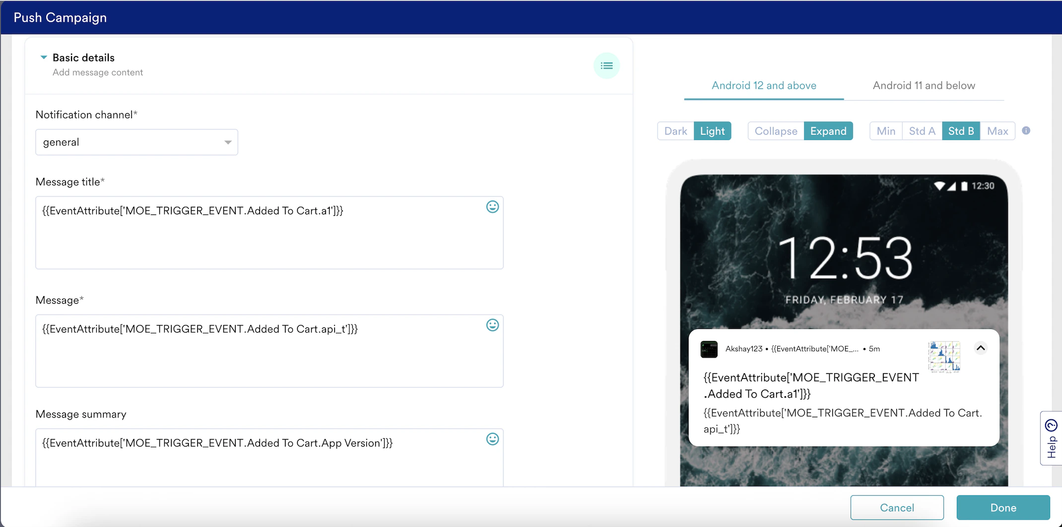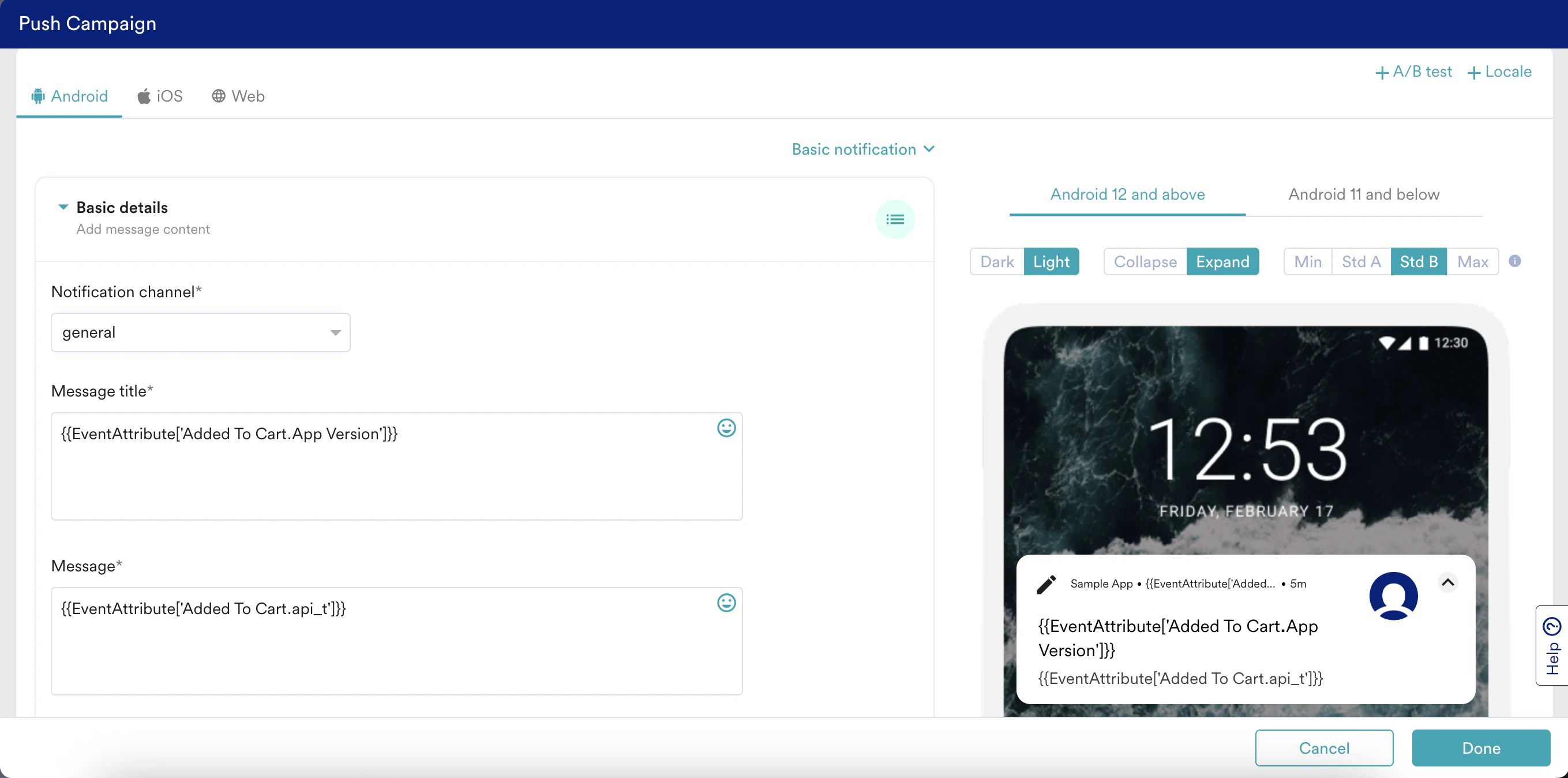 You can personalize your campaigns using data from a user’s most recent instance of a specific event. For example, if a user adds a shirt at 10:00 AM and pants at 10:30 AM, a message personalized with {{EventAttribute['Add to Cart. Product Name']}} will display “Pant” because the 10:30 AM event is the most recent. To personalize a push notification with the Add to Cart, perform the following steps: