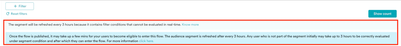 - When filters are added to the All User segment, they are treated as a custom segment. Therefore, custom segments that depend on user attributes may require up to three hours to refresh and include all users.