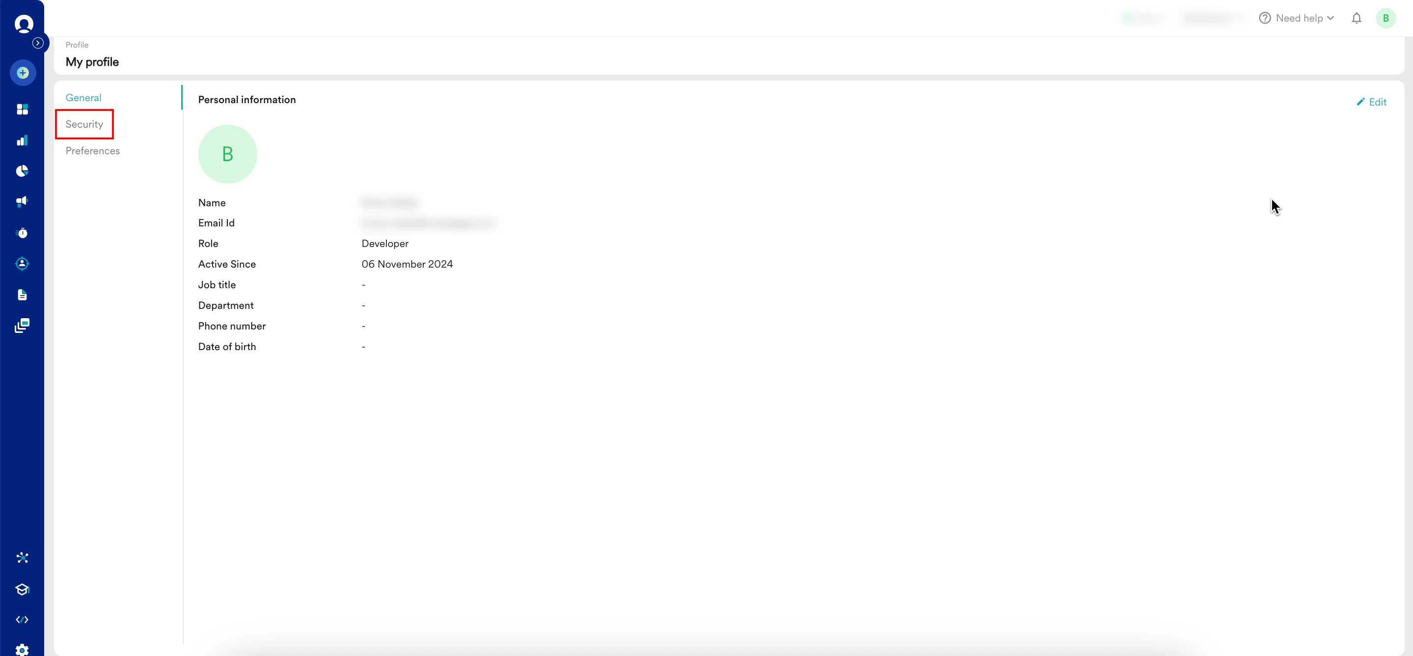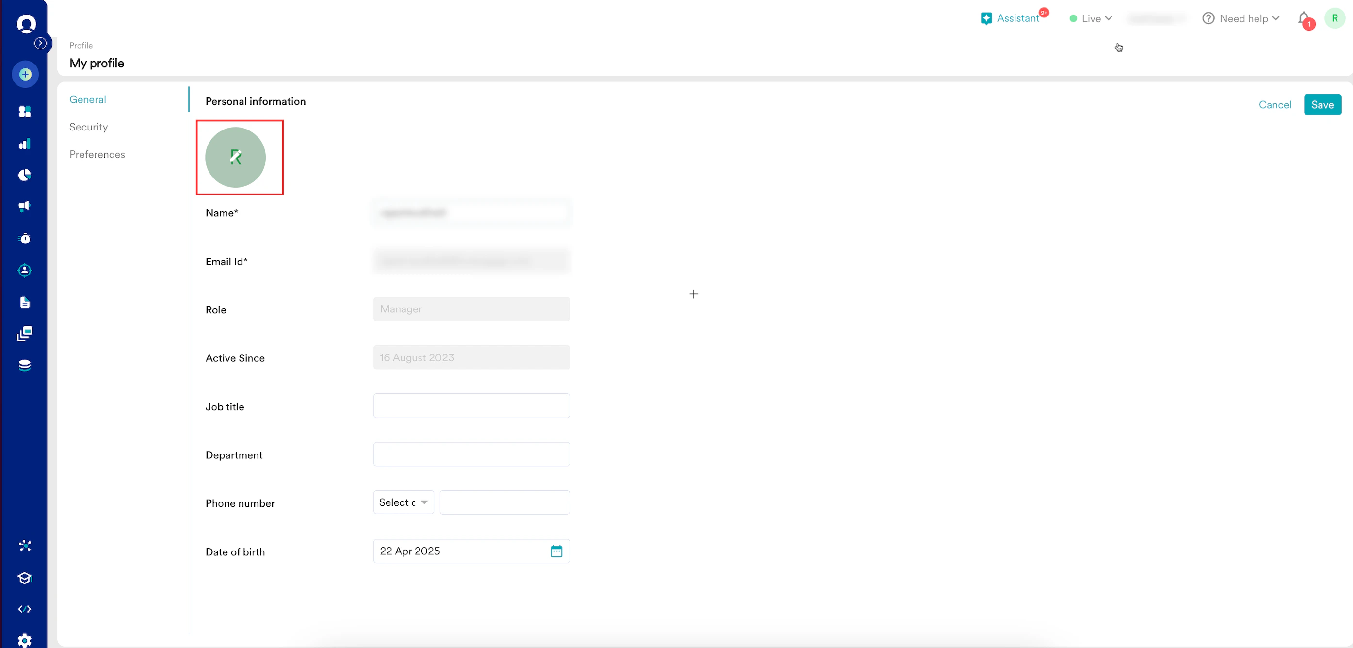 Field Description Name Enter your name. Email Id This field is read-only. Role This field is read-only. Active Since This field is read-only. Job title Enter your job title. Department Enter your department name. Phone number Select your country code and enter your phone number. Date of birth Select your date of birth using the date picker. - Click Save. Your personal information is updated.