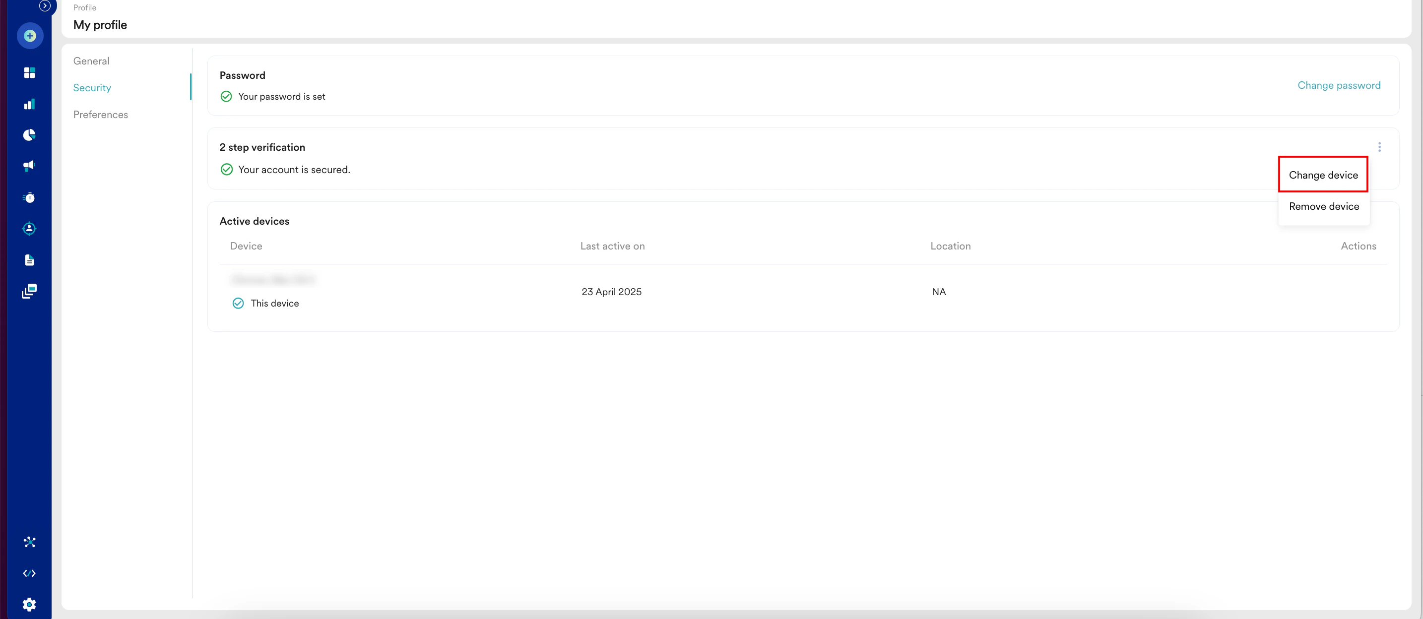 - Click the ellipse icon adjacent to 2 step verification and then click Change device.