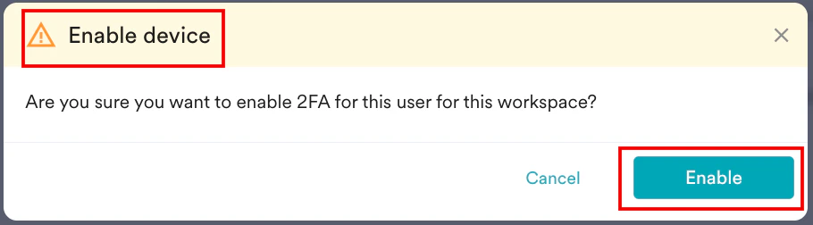 The Enable device pop-up window appears, prompting you for confirmation to enable 2FA for your workspace. - Click Enable.