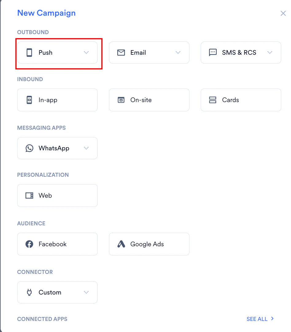 3. On the New Campaign dialog box, under OUTBOUND, click Push.