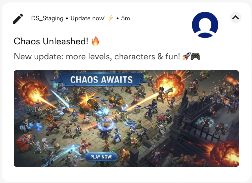 | A dynamic and chaotic battle scene from a mobile game, rendered in a maximalist style with explosive effects and vibrant characters. Add banner message: “Chaos awaits.” and CTA “Play now!” |  |