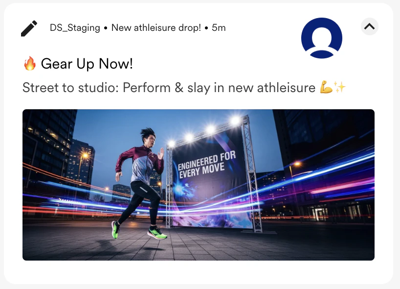| A dynamic, high-energy shot of a person in sleek, colourful activewear, captured mid-run in a modern urban environment, followed by Kinetic light trails. Add a big banner: “Engineered for Every Move.” |  |