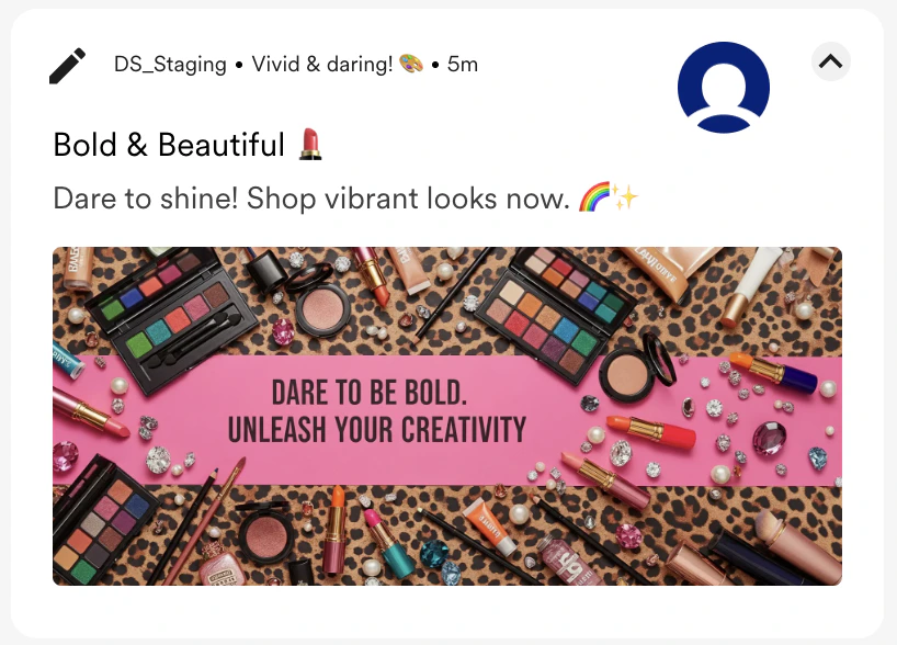 | A maximalist flat lay of bold, colorful makeup products on a leopard print background with scattered jewels. Add a prominent, clearly focused banner message: “Dare to be bold. Unleash your creativity. |  |