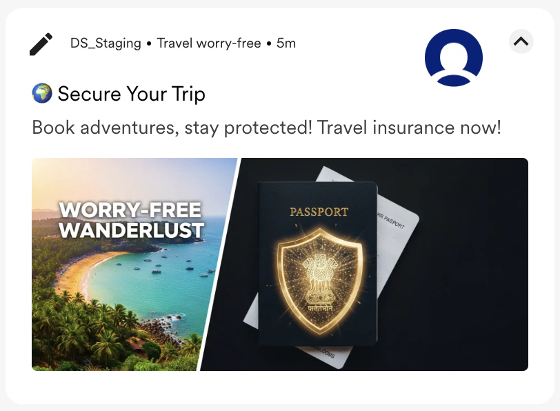 | A split-screen image. On one side, a breathtaking travel scene of a real Goan coast. The other shows a shield superimposed over a passport. Coherently placed big banner typography: “Worry-Free Wanderlust.” |  |