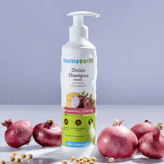 | A close-up shot of the “Mamaearth Onion Shampoo” image in a sunlit garden. |  |