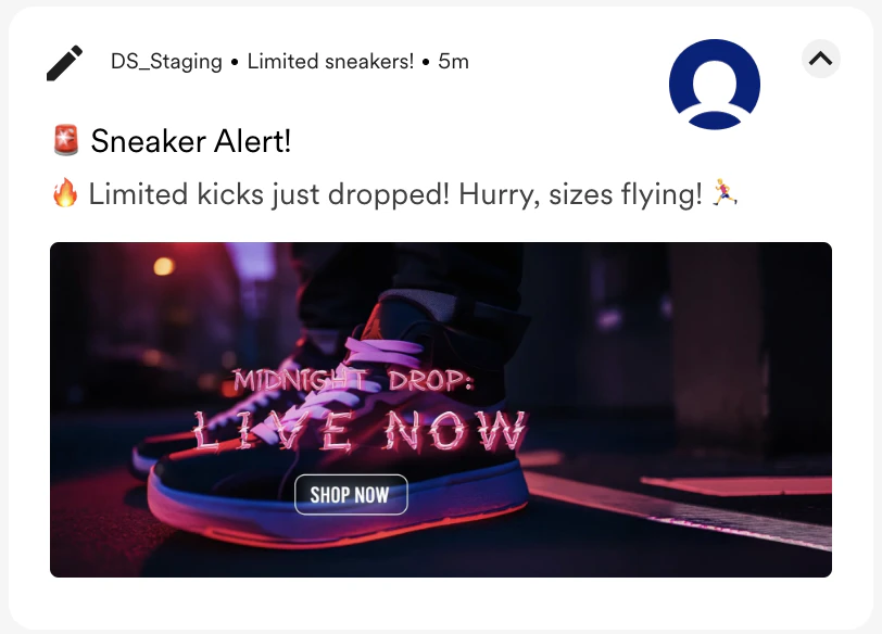 | A person wearing a futuristic “Sneaker”. 3D render, polished metallic finish, abstract background. Glowing neon banner: “Midnight Drop” |  |