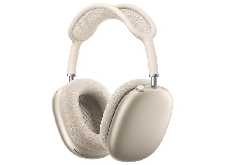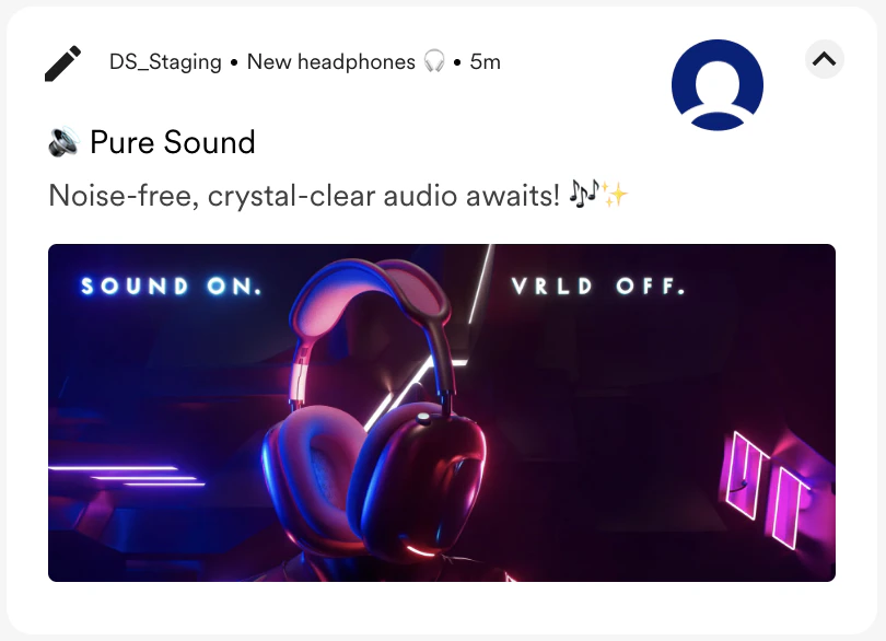 | A futuristic “Apple Headphones” is a 3D render with a polished metallic finish and an abstract background. The glowing neon banner reads, “Sound On. World Off.” |  |