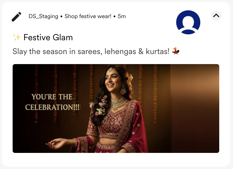 | A hyper-detailed, maximalist shot of a model in luxurious Indian ethnic wear. Focus on the rich texture of velvet and intricate gold embroidery. Add big prominent message: “You’re the celebration!!!” |  |